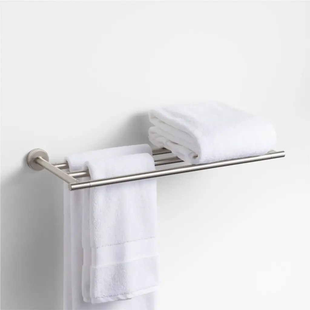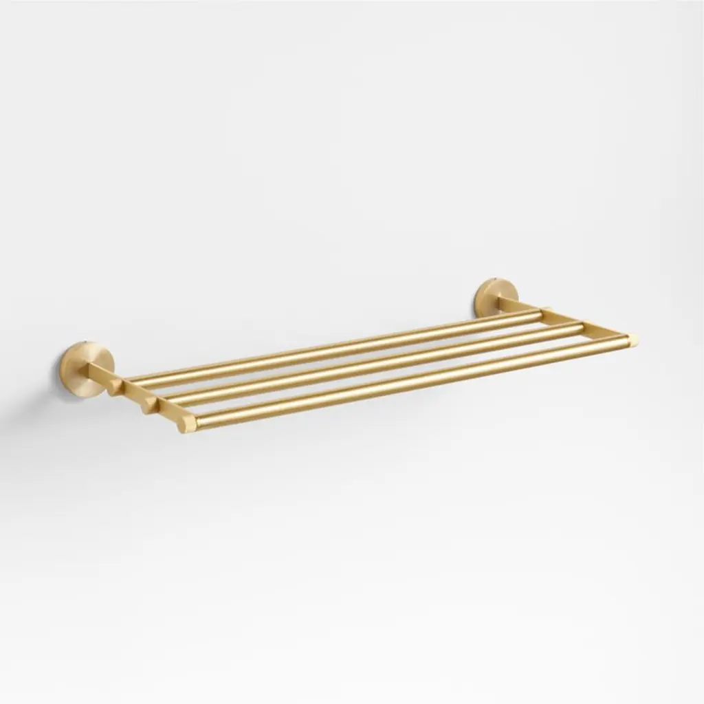 Sometimes it's the small things that pull a room together. That's why we've designed a hardware collection with modern silhouettes, clean lines and a touch of tradition to give your bathroom that perfect finishing touch. Made of brushed brass, this towel rack lends industrial chic to its minimalist design. Extending from flat bars anchored to circular mounts, the rack caps each of its three bars with fluted ends for a bit of texture. The wall-mounted towel rack installs easily with included hardware.