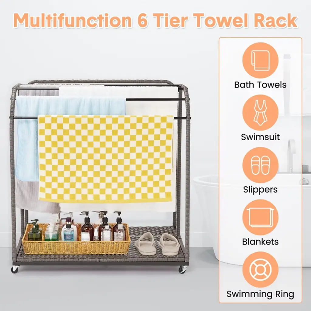 Pool Towel Rack,Outdoor Pool Storage Rack with Rattan Base and 5 Towel Bars,Pool Float Storage with Compartments, Store Buoys, Pool Floats, Swimming Rings, Suitable for Outdoor/Indoor.Boasting dimensions of 37.4"L x 31.5"W x 37.4"H, this pool storage rack is equipped with four movable casters and a sturdy rattan base, making it easy to relocate and store any pool accessories you may need