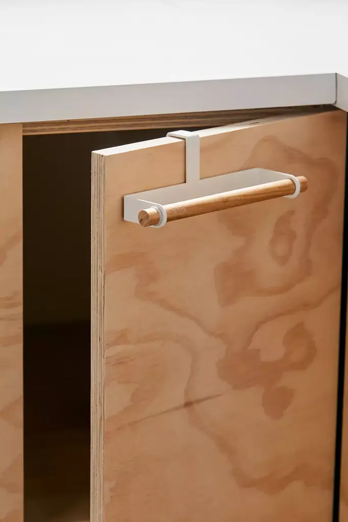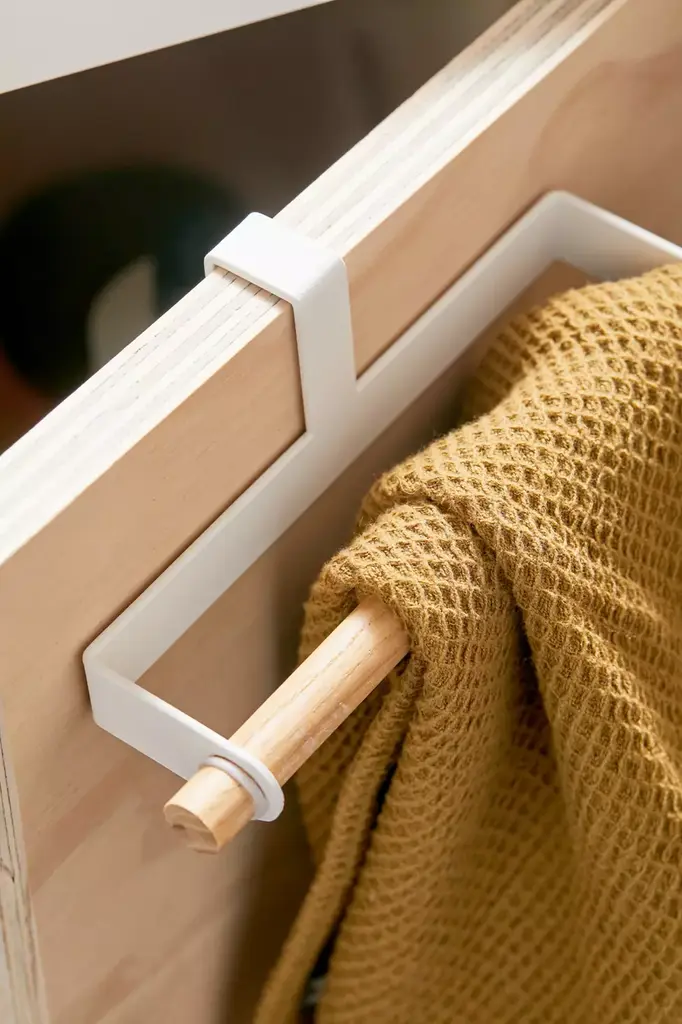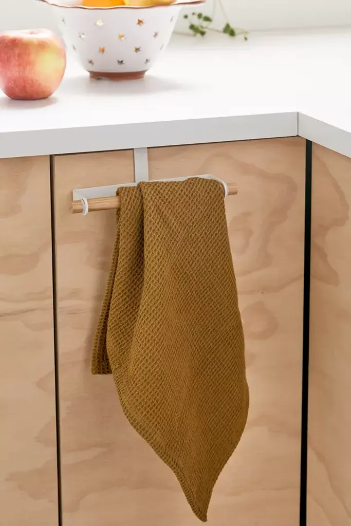Always keep a dish towel within reach thanks to this modern hanger, featuring a steel frame that rests over cabinet doors, complete with a wooden dowel.