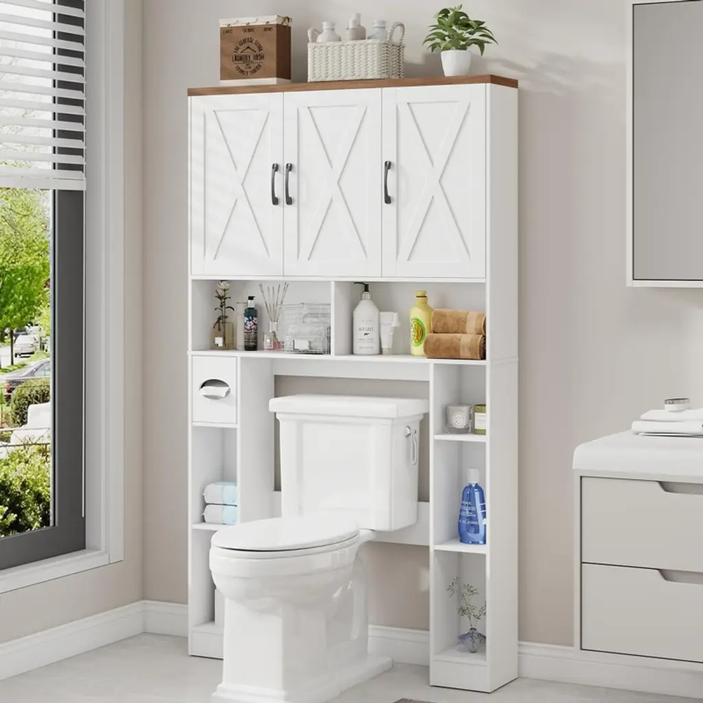 This over-the-toilet storage cabinet, crafted from premium engineered wood, has a farmhouse style—its subtle woodgrain finish adds rustic charm and fits various decors. It features a barn door for hidden towel/toilet paper storage, open shelves for easy-access essentials, and a vertical cabinet for extra rolls. With adjustable/removable shelves (plus lower side shelves) for custom space, it measures 67"x39"x7.7" (check dimensions first).