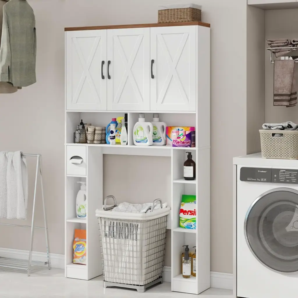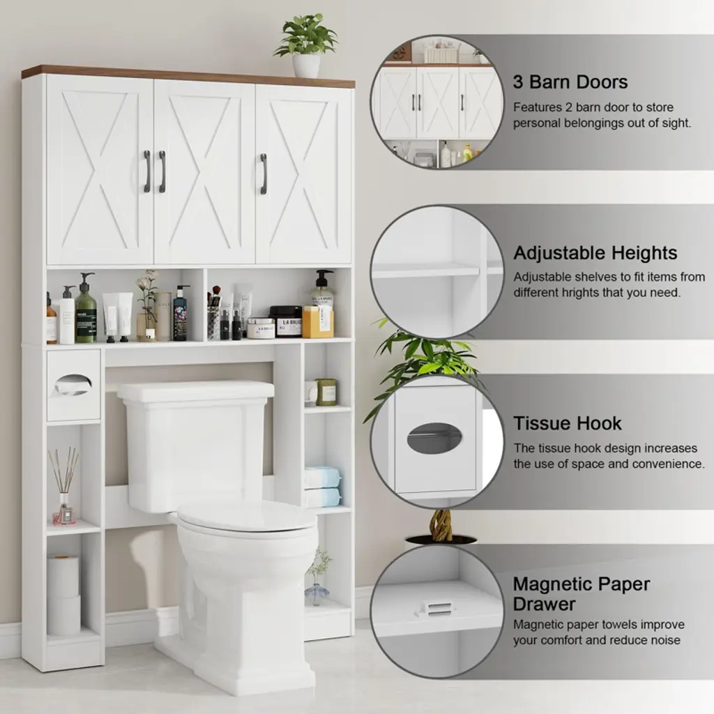 Over The Toilet Storage Cabinet With 3 Barn Doors, Farmhouse Toilet Paper Holder And Towel Rack, White