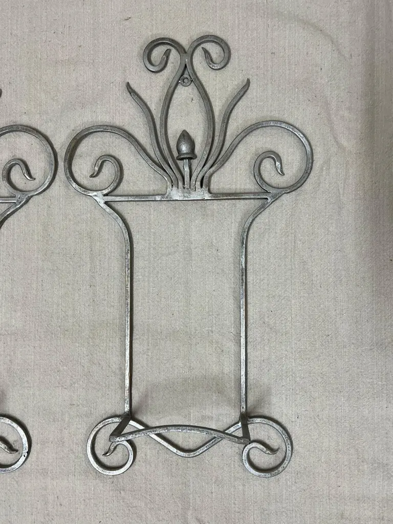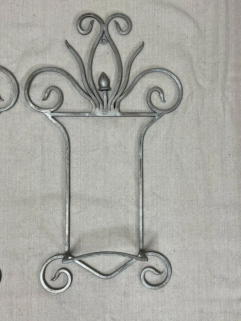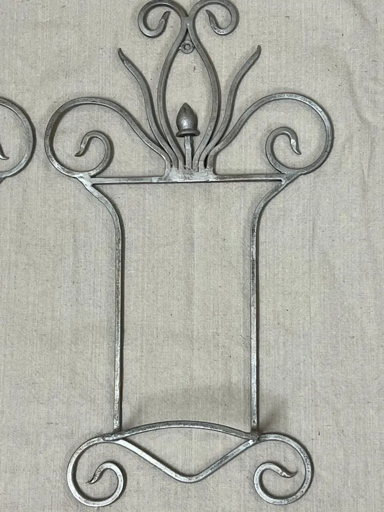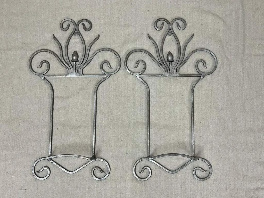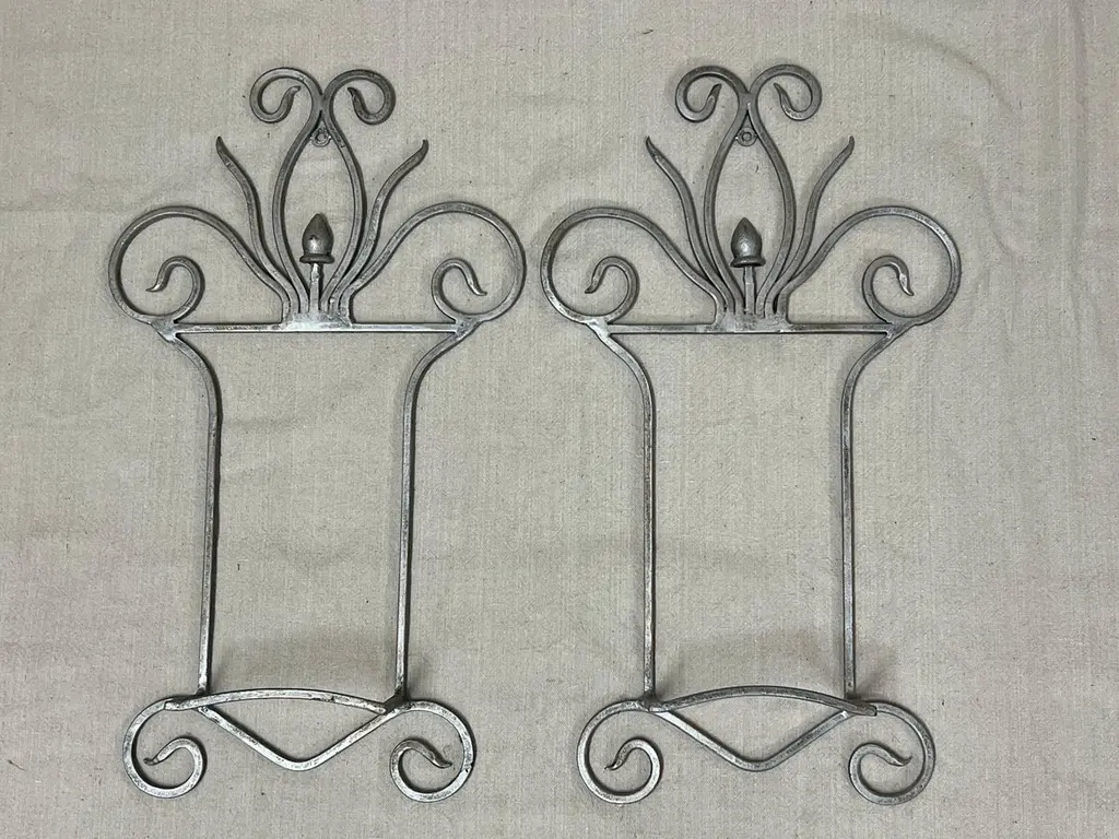Price is for 2 . A pair. Pair of Large Silver Floral Hand Towel Racks. Nice decorative racks to hold towels or scarves . Perfect for that formal powder room to hold your monogrammed linen hand towels. Or use in a dressing room to hang scarves on. Silver painted iron. Heavy and well made. Parcel ship quickly.