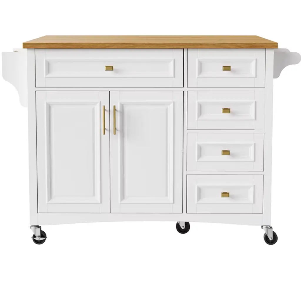 Pdtend Embossed Texture Kitchen Island With Drop Leaf, Spice Rack, Towel Rack, 2 Doors, 5 Drawers, Rolling Kitchen Storage Cart - White