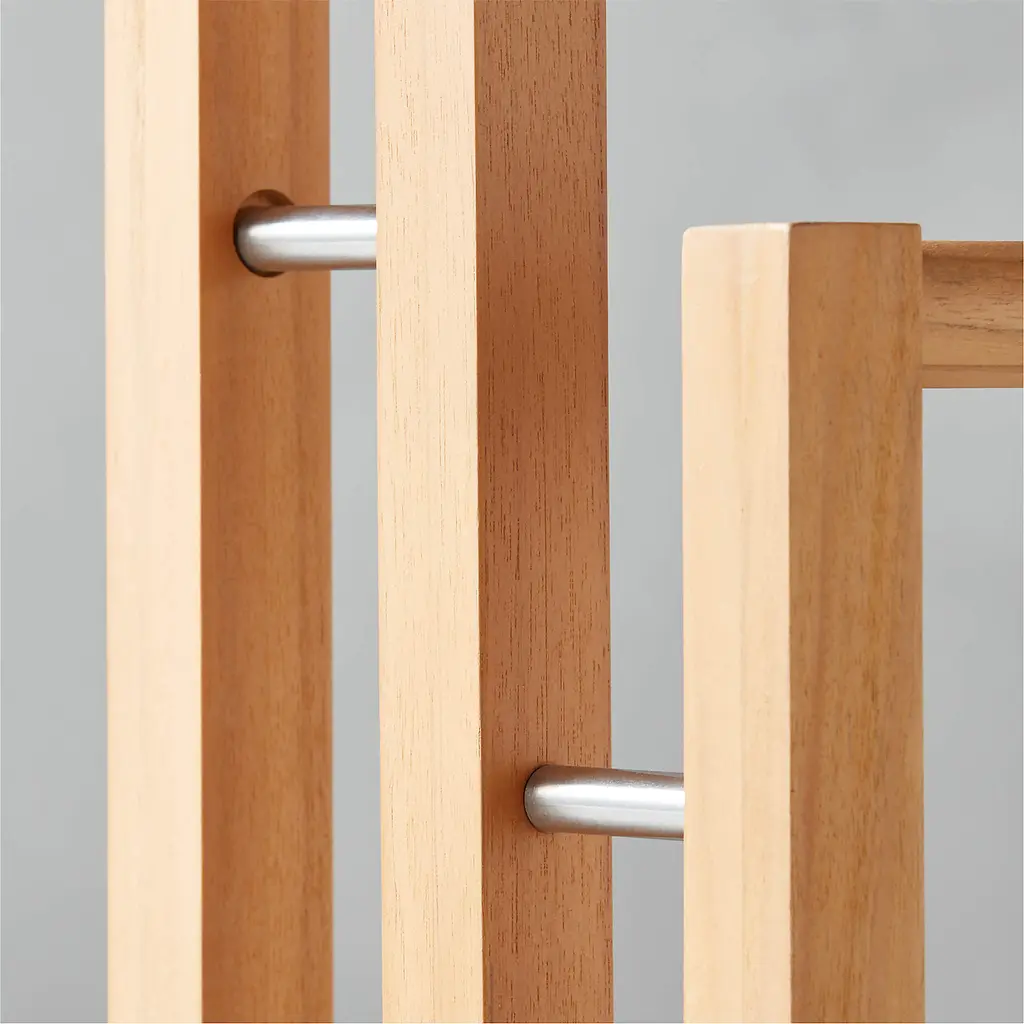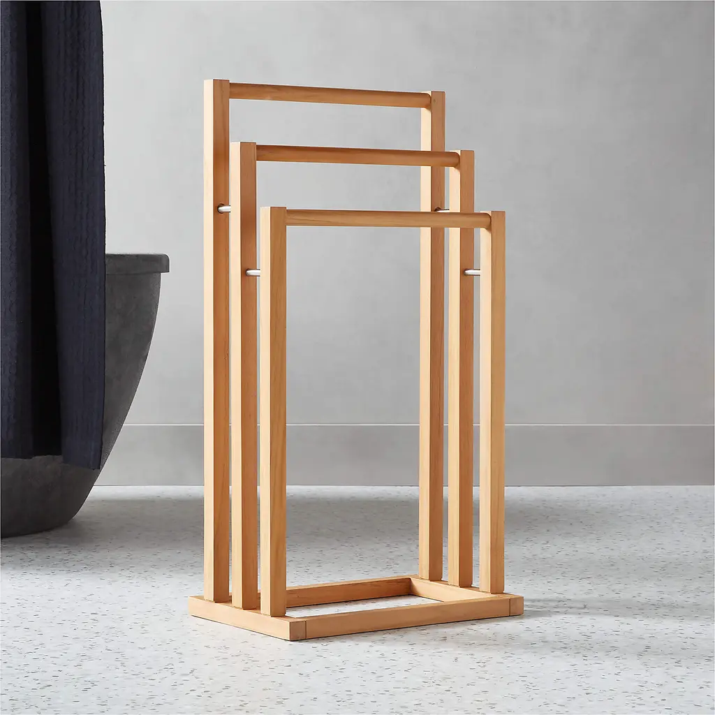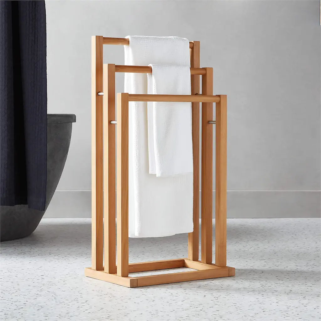 Minimalist towel rack by Los Angeles-based designer Ross Cassidy adds an architectural sensibility to the bath. Honeyed tones of teak, certified sustainable by the Forest Stewardship Council ® (FSC), are accented by stainless steel spacers. Three racks are sized perfectly to accommodate bath towels. CB2 exclusive.
