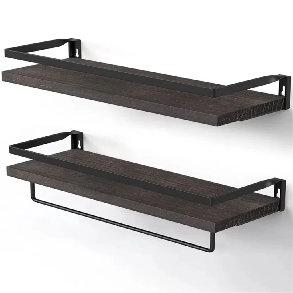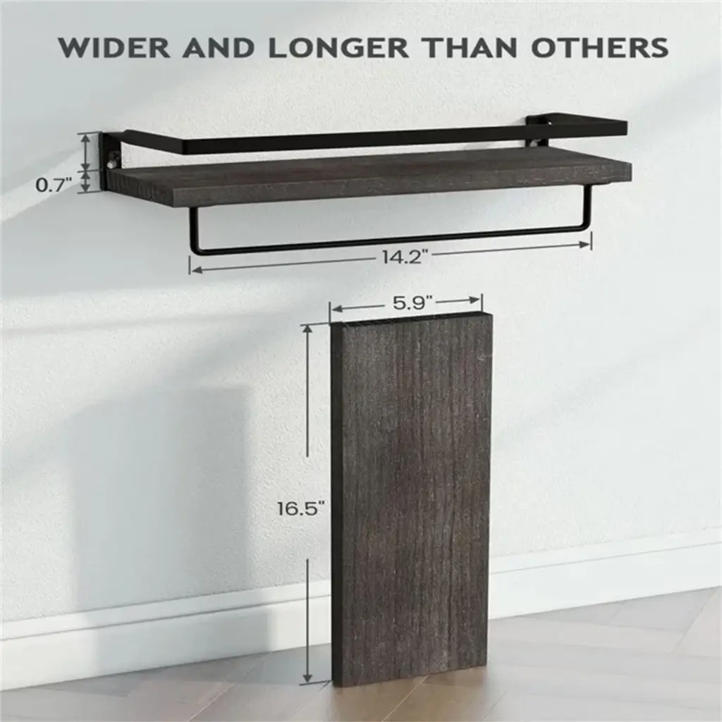 A Touch of Rustic - Floating Wall Shelf With Towel Bar Our wall shelves provide a sophisticated modern look that blends with any theme. Made of solid paulownia wood, our floating shelves are as much a unique piece of art as a storage item, with beautiful grain patterns and colors that stand out. Decorate your walls with our floating shelves that look as lovely paired together as they do apart. In the bathroom, you can enjoy a relaxing and comfortable bath with the wall shelf where the clothes, towels, roll tissues, or clean products sit on it. In the kitchen, you can always enjoy easier cooking with the wall shelf where you can store the spices on it within your reach.