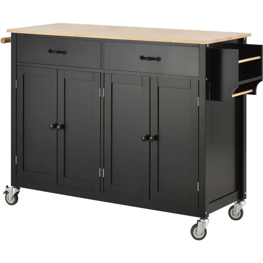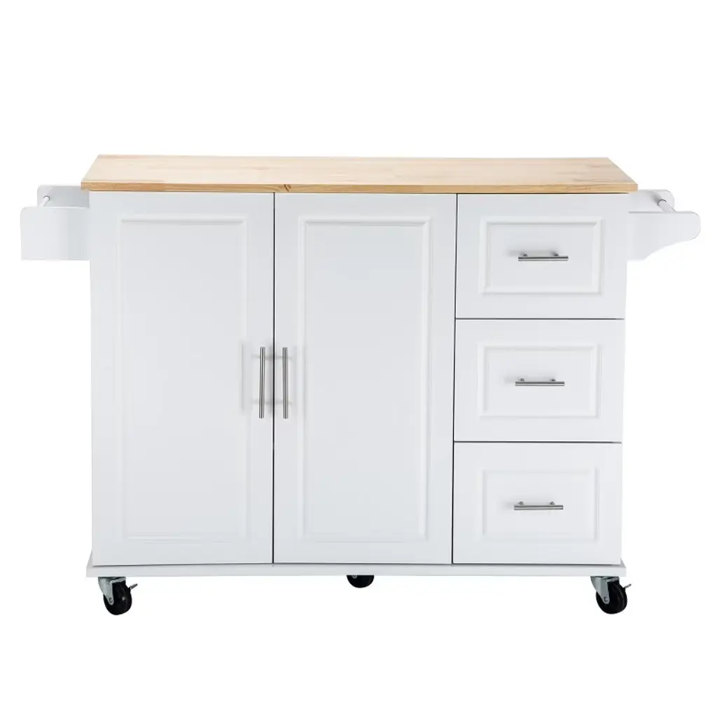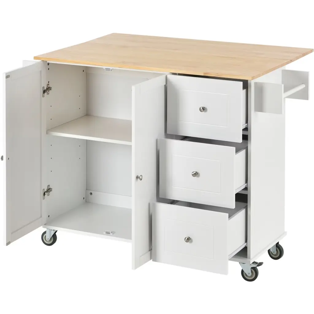 The Rolling Mobile Kitchen Island with Folding Leaf is a versatile piece of furniture with an ample storage cabinet with adjustable shelves, three storage drawers, a spice rack, and a towel rack, providing ample storage space and a convenient breakfast bar.