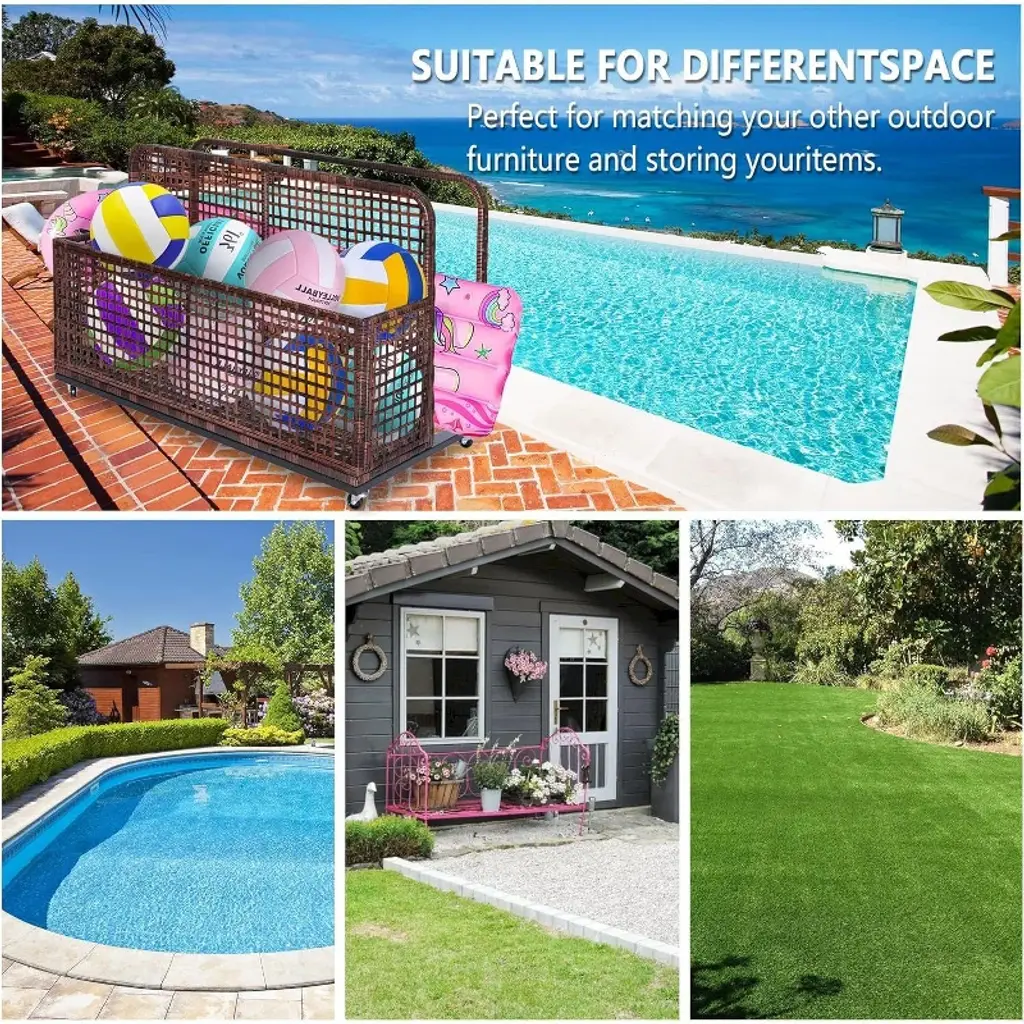 Looking to keep your poolside organized and stylish? This rolling pool float storage caddy combines a woven wicker basket, towel rack, and smooth wheels for effortless storage and mobility—perfect for floats, toys, and summer essentials! Highlights at a glance:Includes a practical towel rack for easy access to clean, dry towels.Spacious woven wicker basket stores floats, noodles, toys, and beach balls.Durable powder-coated iron frame and PE rattan for outdoor use.Four smooth-rolling wheels for easy mobility around the pool or patio.Minimalist farmhouse design blends seamlessly with modern outdoor décor.Clear instructions and labeled parts make setup quick and hassle-free.Perfect for keeping poolside areas tidy and organized all season long. Specification:Size: 43.3x22.5x28.7 inchesBasket Size: 42x10x14.3 inchesMaterial: PE+Iron Friendly note:Place the pool float storage organizer on a flat, stable surface to ensure safety and prevent tipping.Avoid overloading basket to maintain its durability and stability.Keep the organizer away from direct exposure to harsh chemicals or abrasive materials to preserve its finish.Regularly wipe down the storage organizer with a damp cloth to keep it clean and maintain its appearance. Packing List:1xPool Float Storage Organizer1xInstruction Manual1xAssembly Kit