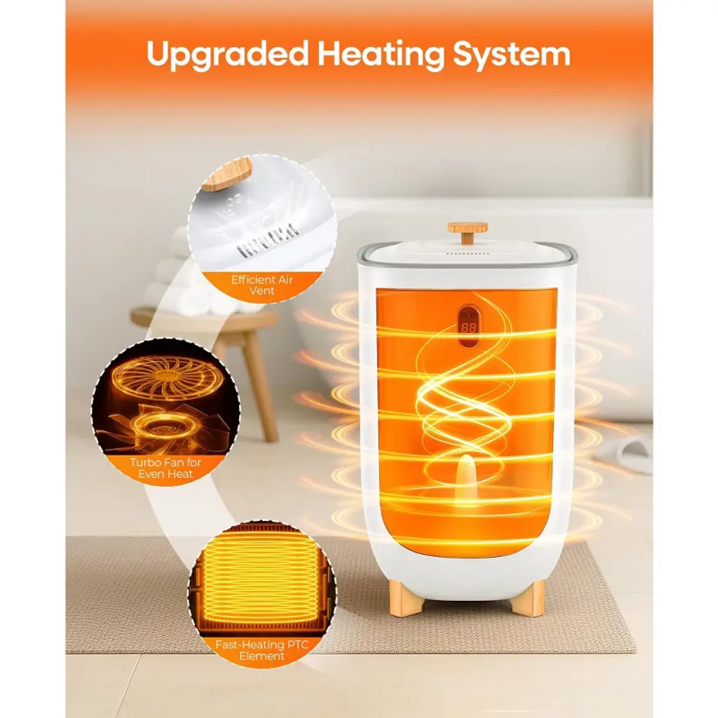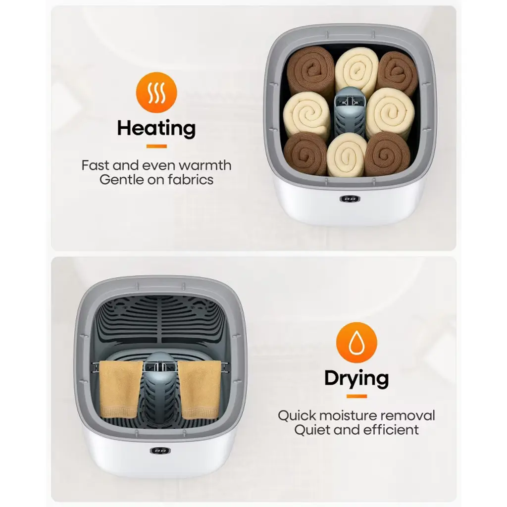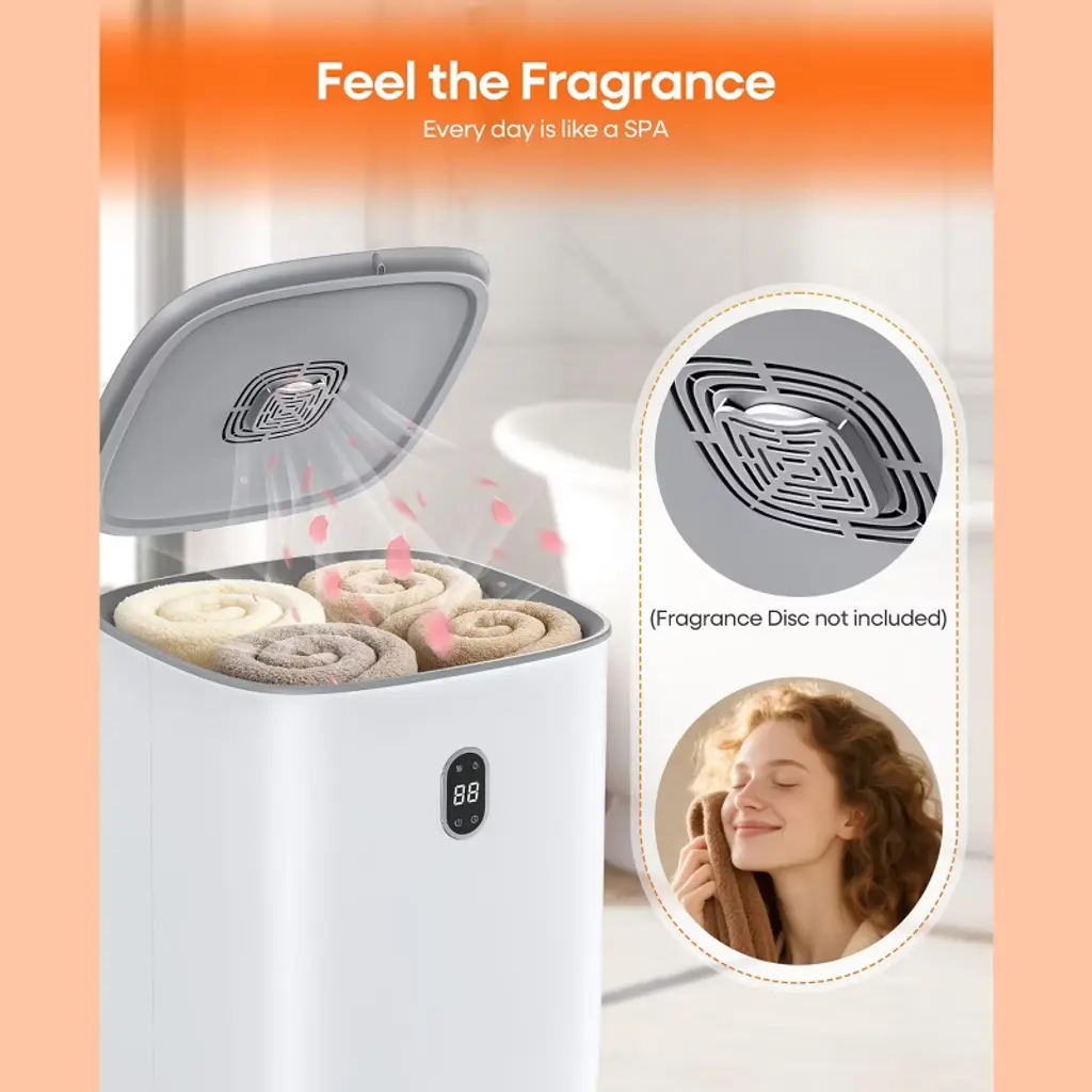Enjoy warm, fluffy towels every time with our 35L towel warmer. Dual heat and dry modes (20–90 min heat or 2–5 hr drying) keep towels fluffy, fresh, and mildew-free . Rapid PTC heating and turbo fan ensure even warmth, while the built-in fragrance tray adds spa-fresh scents. Sleek, compact design fits any bathroom. Specifications Material: PP, PC, Plastic, Stainless Steel Overall Dimension: 14.5" x 14.5" x 25.9" (L x W x H) Voltage: 120V/60Hz Max Power: 900W Capacity: 35L Power Cord Length: 5.7 ft Net Weight: 10 lbs