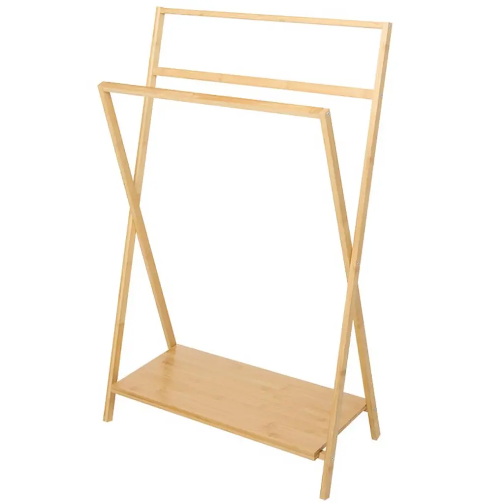 The 38.5" Tall Bamboo Wood Towel Rack with Bottom Organizing Shelf is a practical way to maximize the limited space in your bathroom. Crafted with attention to detail, this elegant towel rack seamlessly blends functionality with a touch of organic beauty, perfect for enhancing your bathroom's ambiance. Your towels neatly organized and within easy reach after your morning shower, all thanks to the smartly designed bottom shelf that keeps essentials like toiletries in check. Not only does it hold up to 30 lbs., ensuring you have ample space for everything you need, but it also complements any decor with its natural aesthetic. Your bath will feel less cluttered and more serene. Constructed from sustainable bamboo, it's an eco-friendly choice for those who care about the planet as much as they care about their style. Whether you're revamping your entire bathroom or just looking to add a chic storage solution, this bamboo towel rack is an ideal choice. The compact dimensions ensure it fits comfortably in most bathrooms while providing enough room to keep your space organized. Key Features:Stylish and durable bamboo constructionHolds up to 30 lbs. on the bottom shelfEnhances bathroom organization and styleEco-friendly and sustainable materialCompact design fits comfortably in most bathrooms. Made of: Bamboo Measurements: 24.40"W x 11.81"D x 38.58"H Notes: Assembly required; assembly hardware included