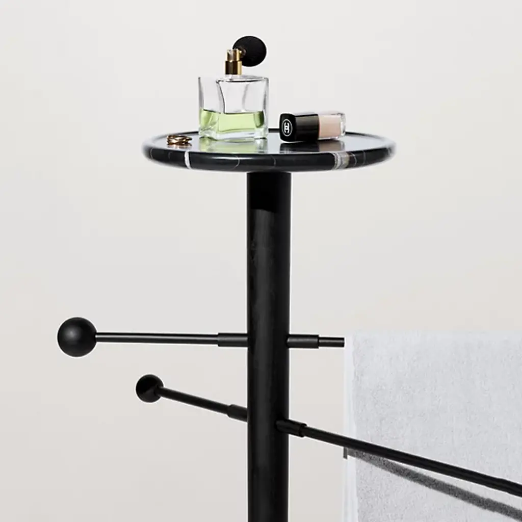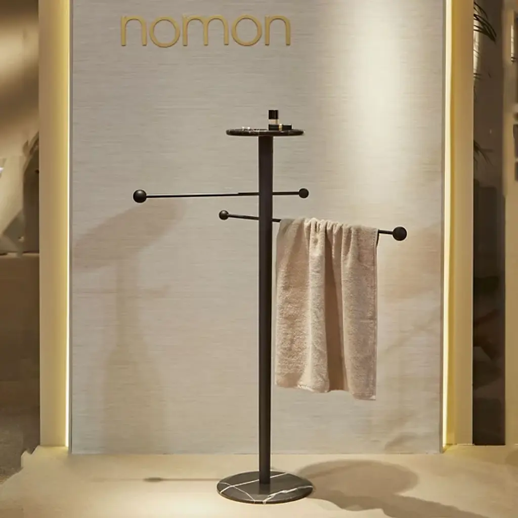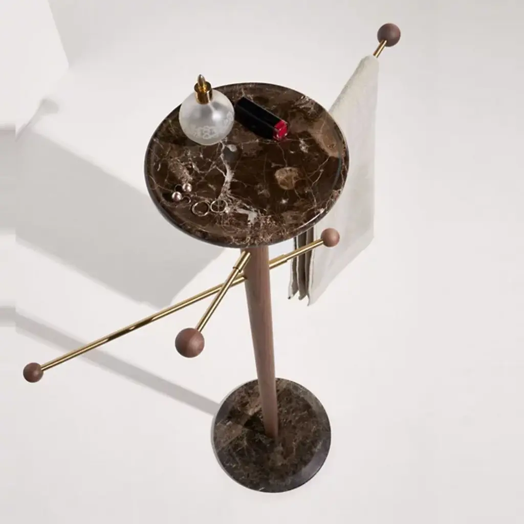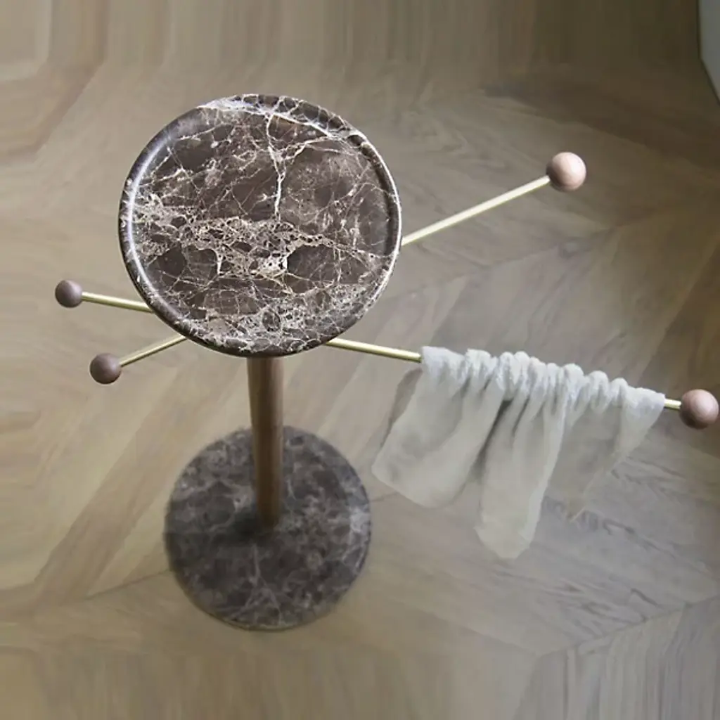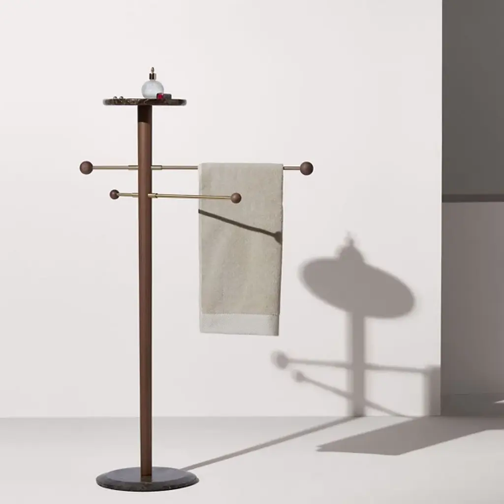The Toallero Towel Stand by Nomon is at your service. Designed by Andres Martinez, this slender structure boasts a marble base and tray, while brass rods capped with wood spheres extend to form tasteful hangers. Ideal in a bedroom, bathroom, or entryway, this piece makes a refined statement in any home.