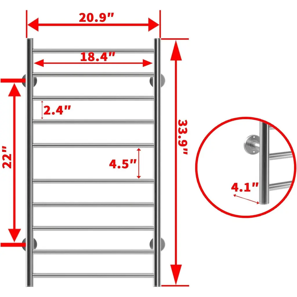 Premium Construction: The heated towel rack has an aluminum frame with a brushed chrome finish for excellent corrosion resistance, ensuring a stylish appearance and long-lasting durability.Fast Heating: Towel heater reaches optimal temperature of 122 F in 30 minutes. Clothes, socks, and towels can be hung on the rack without worrying about being burned.LED Control Panel: The towel warmer comes with an LED control panel that allows users to easily adjust the temperature, set the timer, and turn the device on/off with just a few clicks.Bring Warmth and Health To Your Family: The towel warmer rack can dry and warm towels easily, and can be turned on for a long time to dry towels and baby sets, socks.Easy to Install: Whether you have a new bathroom or are remodeling it, our heaters combine practical and decorative features to keep towels dry and organized. Product DescriptionName: Towel Warmer RackMain Material: AluminumColor: Black,SilverUse Case: BathroomVoltage: 110VPower: 105WWorking temperature: 50 ℃± 5 ℃Preheating time: 15 minutesBlack--Wire length: 31.5 inchSilver--Wire length: 70.9 inchBlack--Product Dimensions(in.):18.40x 4.10x 16.10,3.30lbs.Silver--Product Dimensions(in.):20.90x 4.10x 33.90,6.17lbs.Package Number:1Package Size :①Black-21.26x 1.77x 16.88in,4.40lbs;②Silver-21.26x 1.97x 34.84in,9.26lbs.Packing list:1x Towel Warmer Rack