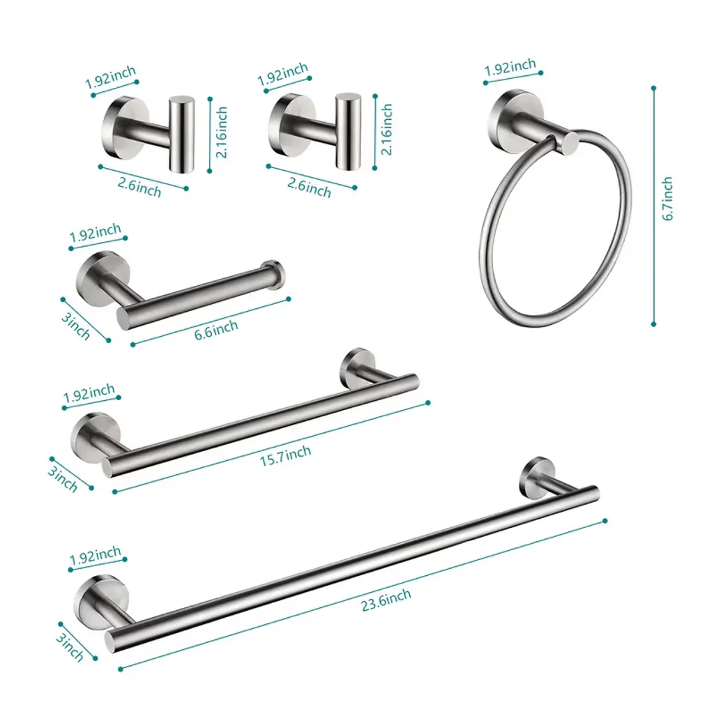 Enhance your bathroom with this elegant 6-piece stainless steel towel rack set. The contemporary design features hidden mounting holes for a seamless, floating look, while smooth edges ensure safety and comfort. Perfect for adding a touch of sophistication while keeping towels and essentials neatly organized.