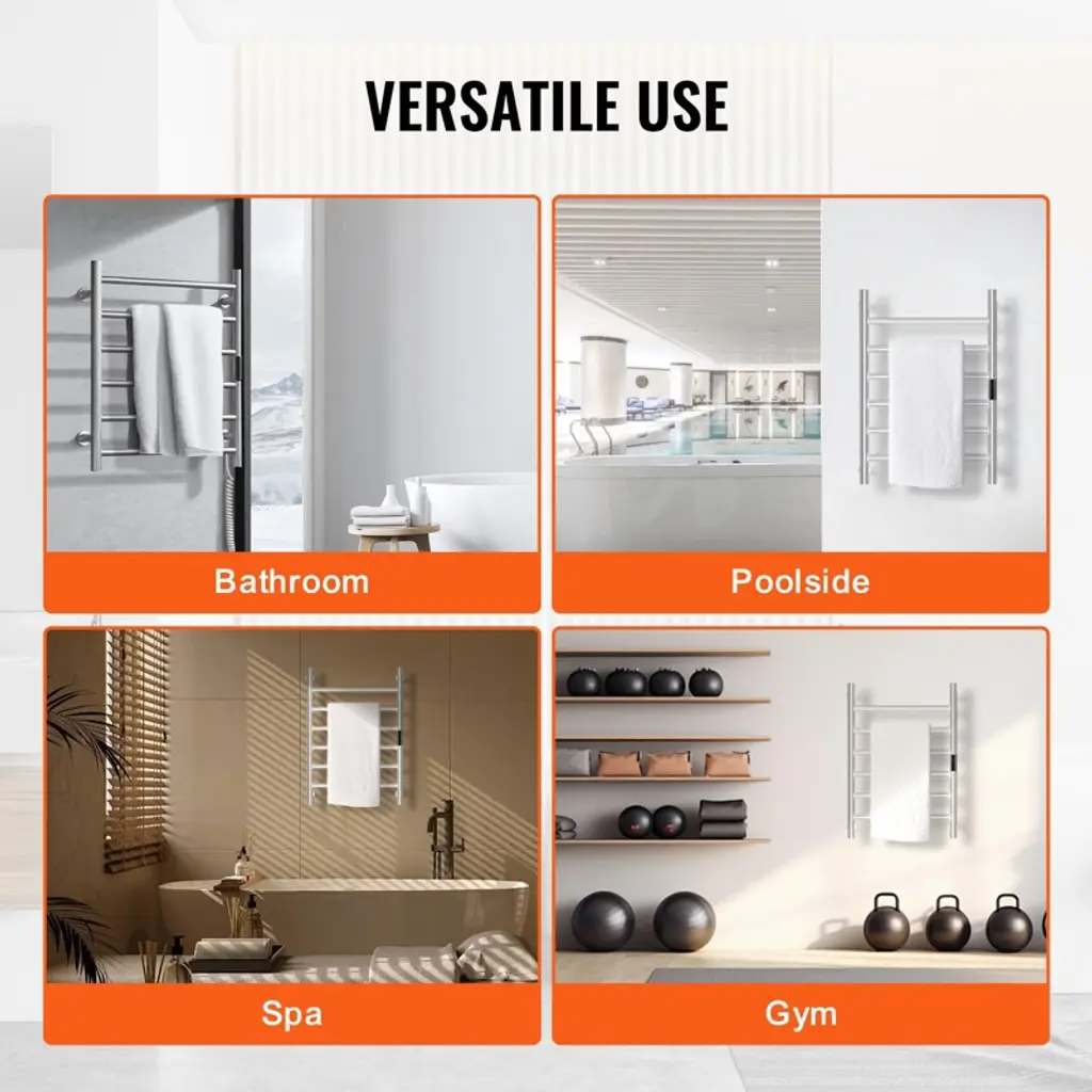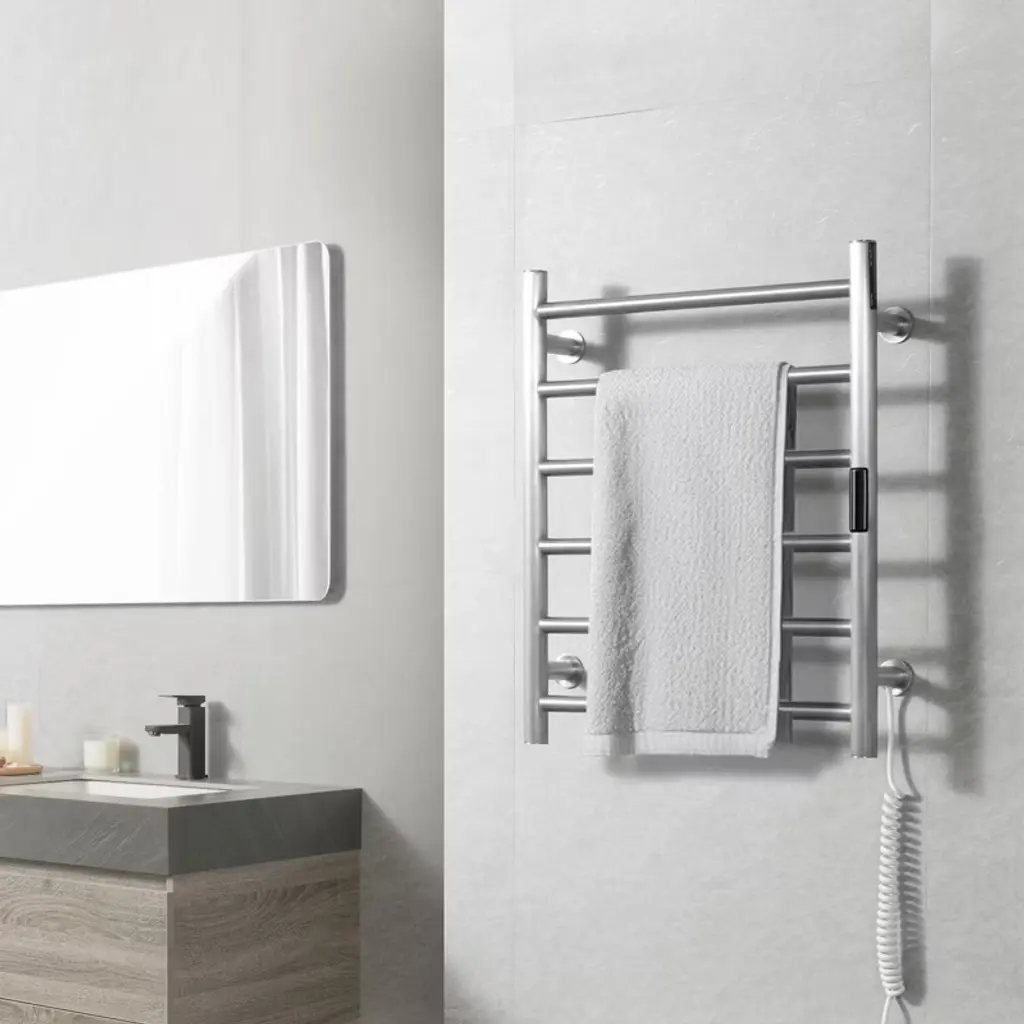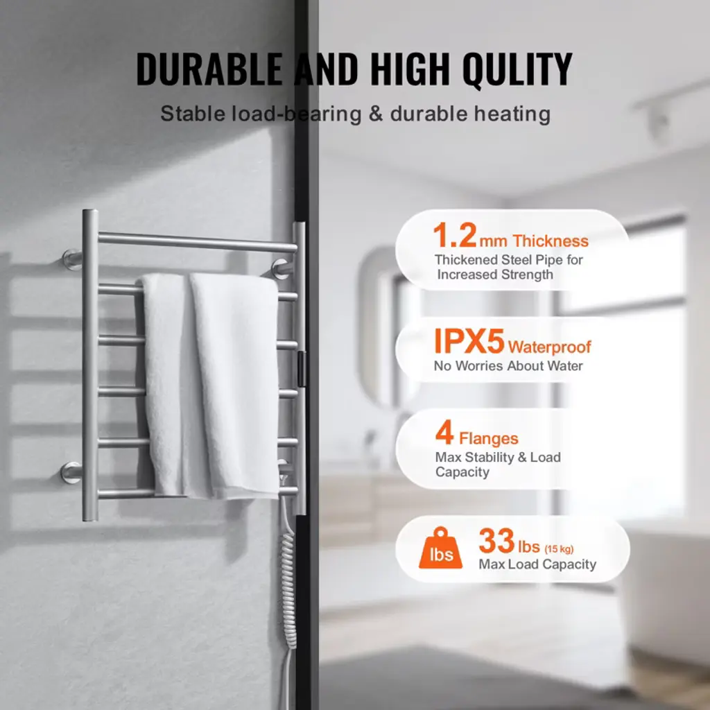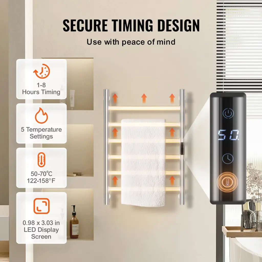 Feature: Rapid Heating: This towel warmer rack heats up to 131°F/55°C in just 5-10 minutes, ensuring efficient drying. With a 5-level temperature adjustment feature, you can set the temperature to your preferred level for optimal drying results. Smart Timer: The heated towel rack comes with a built-in timer, allowing you to set heating times from 1 to 8 hours according to your needs. This feature eliminates safety concerns associated with prolonged use and saves you time and effort. High Quality: Built with a thick wall design, this towel warmer is durable and provides consistent heating. Its neat left and right wiring layout enhances the product’s appearance and ensures a clean look. Stylish and Practical: The stainless steel material not only adds a sleek appearance but also makes cleaning easier. The organized wiring layout further improves the overall aesthetics of the product. Stable Load Capacity: Enhanced with a flange for increased stability and load-bearing capacity, this towel heater offers reliable performance. It is a perfect solution for warming towels and clothes. Package Content 4 x Sleeve 4 x Internal Hexagon Top Wire 2 x Internal Hexagon Screw 2 x Cross Screw 2 x Internal Hexagon Wrench 4 Sets of Plastic Expansion Bolt 4 x Flange Column