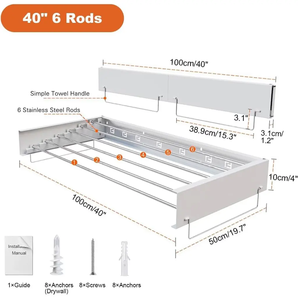Introducing our versatile Wall Mounted Clothes Rack, the perfect solution for drying clothes and towels both indoors and outdoors. Designed with convenience and space-saving in mind, this folding drying rack is ideal for laundry rooms, bathrooms, balconies, and any area where you need efficient drying options. This retractable towel rack features 6 sturdy rods, providing ample space to hang multiple garments or towels at once. Its wall-mounted design keeps your floor space clear, making it an excellent choice for small apartments or homes with limited room. The rack folds neatly against the wall when not in use, ensuring a clutter-free environment. Crafted from durable materials, this clothes rack is suitable for indoor and outdoor use, resisting wear and tear from daily use and weather exposure. Installation is quick and easy with all necessary hardware included, allowing you to mount it securely on any wall surface. Key Features: - Indoor folding clothes rack that saves space and keeps your laundry organized - Wall-mounted design for a clean, floor-free drying solution - Ideal for balconies, bathrooms, and laundry rooms - Retractable towel rack with 6 rods to accommodate multiple items - Foldable and easy to store when not in use - Durable construction suitable for indoor and outdoor environments Upgrade your drying experience with this multifunctional wall-mounted clothes rack. Whether you need a reliable towel rack in the bathroom or a practical drying solution on your balcony, this foldable rack offers convenience, durability, and style in one compact design.