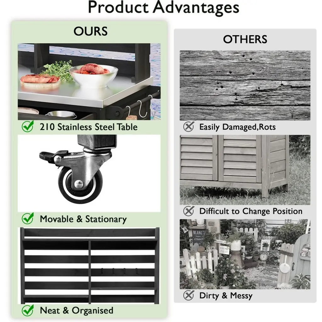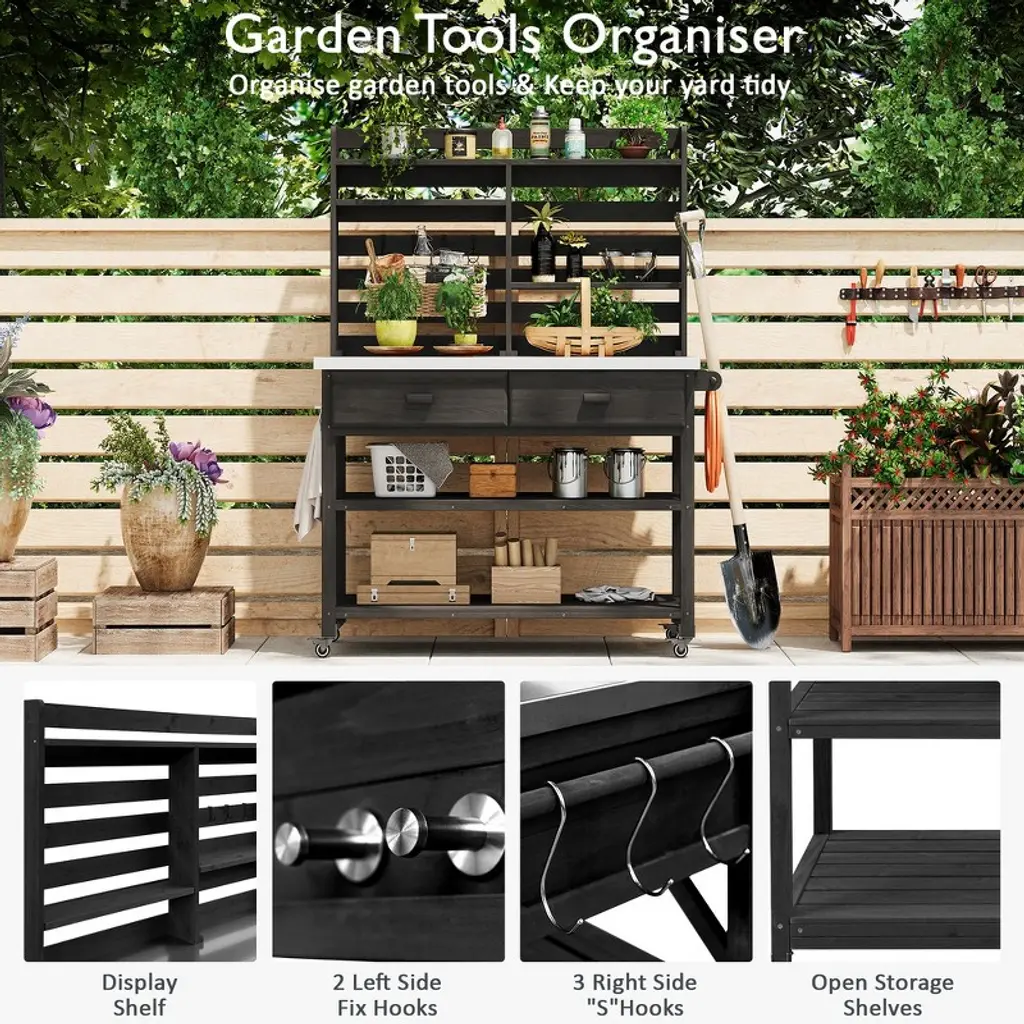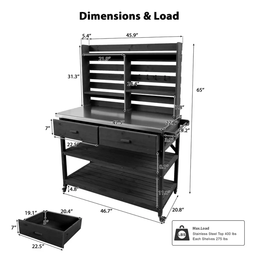 Elevate your gardening and outdoor kitchen experience with this 64.9" outdoor potting bench, designed for both functionality and durability. Crafted from 100% premium fir wood, it offers a natural aesthetic while ensuring skin-friendly use with minimal chemical treatments. The spacious 47.5" x 22.2" stainless steel tabletop provides an easy-to-clean, weather-resistant work surface, perfect for gardening, meal prep, or serving guests. Thoughtfully designed with ample storage, it features two large drawers, dual lower slatted shelves, and an elevated hutch with adjustable side shelves for ultimate organization. Additional details like removable S-hooks, a towel rack, and a propane tank mounting position enhance its versatility. With four lockable wheels for stability and easy mobility, this potting bench adapts to different outdoor conditions, making it an essential addition to any garden, patio, or outdoor kitchen setup.