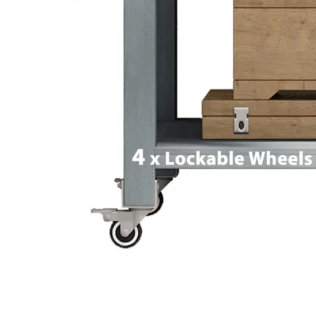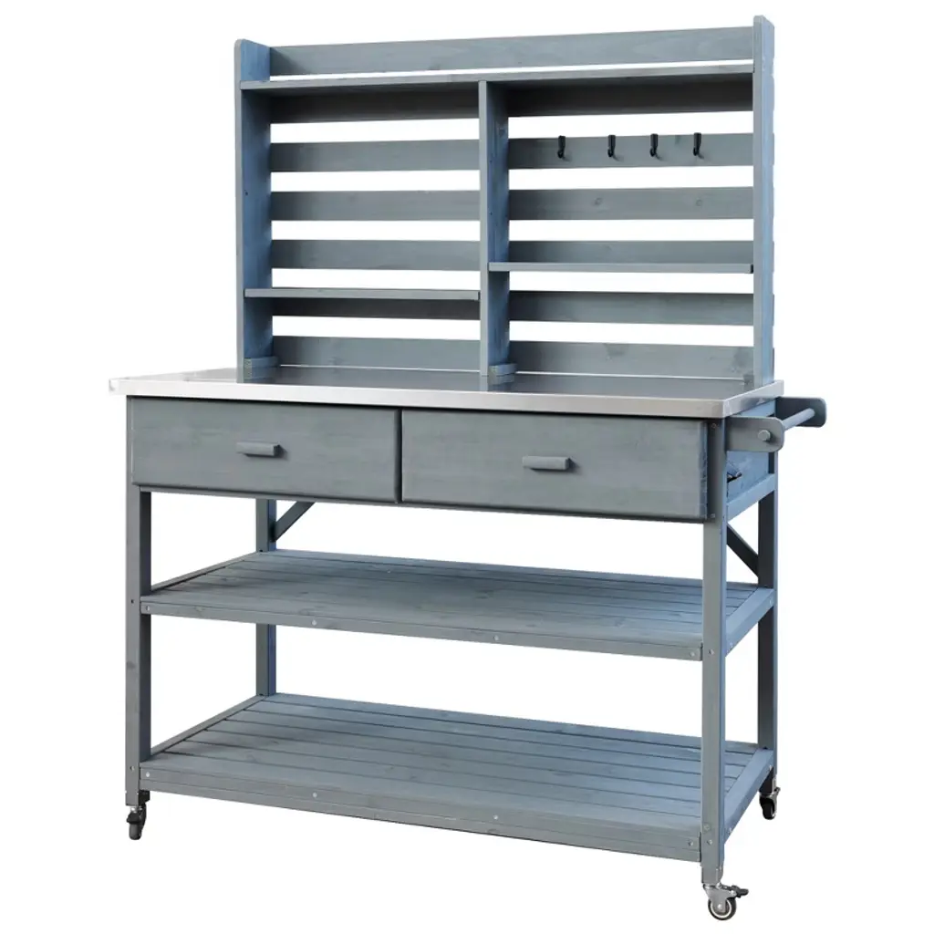 Whisen 64.9"h Outdoor Potting Bench Table With Lockable Wheels, Solid Wood Outdoor Kitchen Island With Upper Hutch And Towel Rack - Grayish Blue