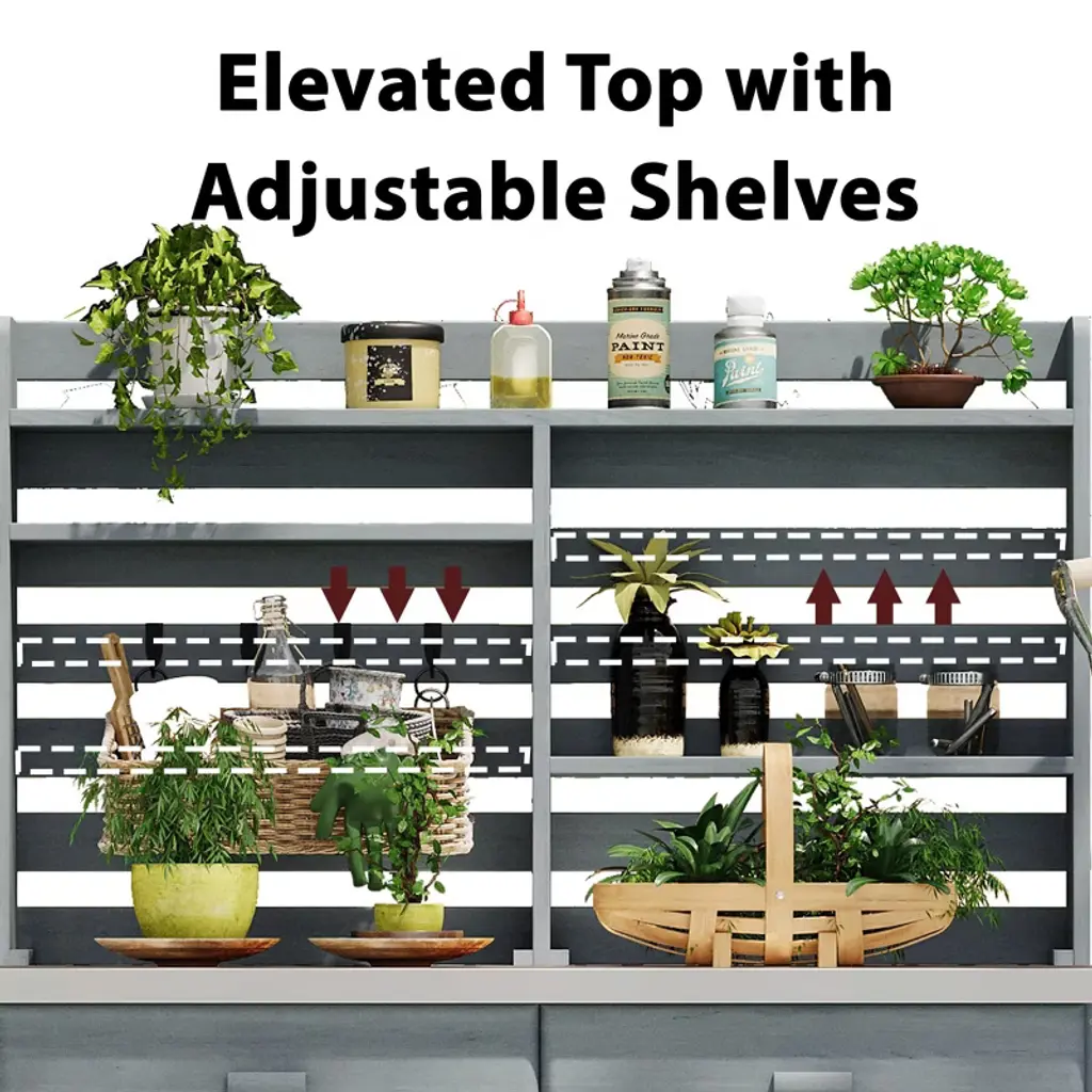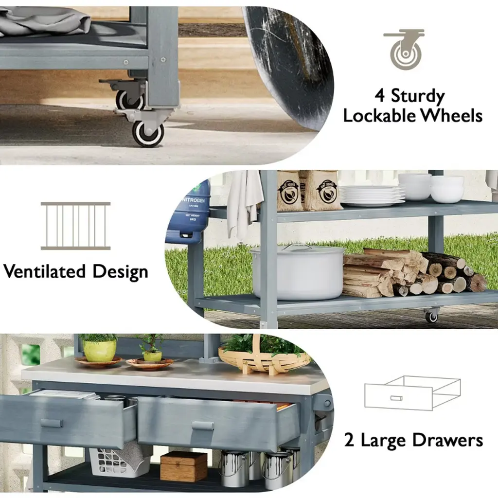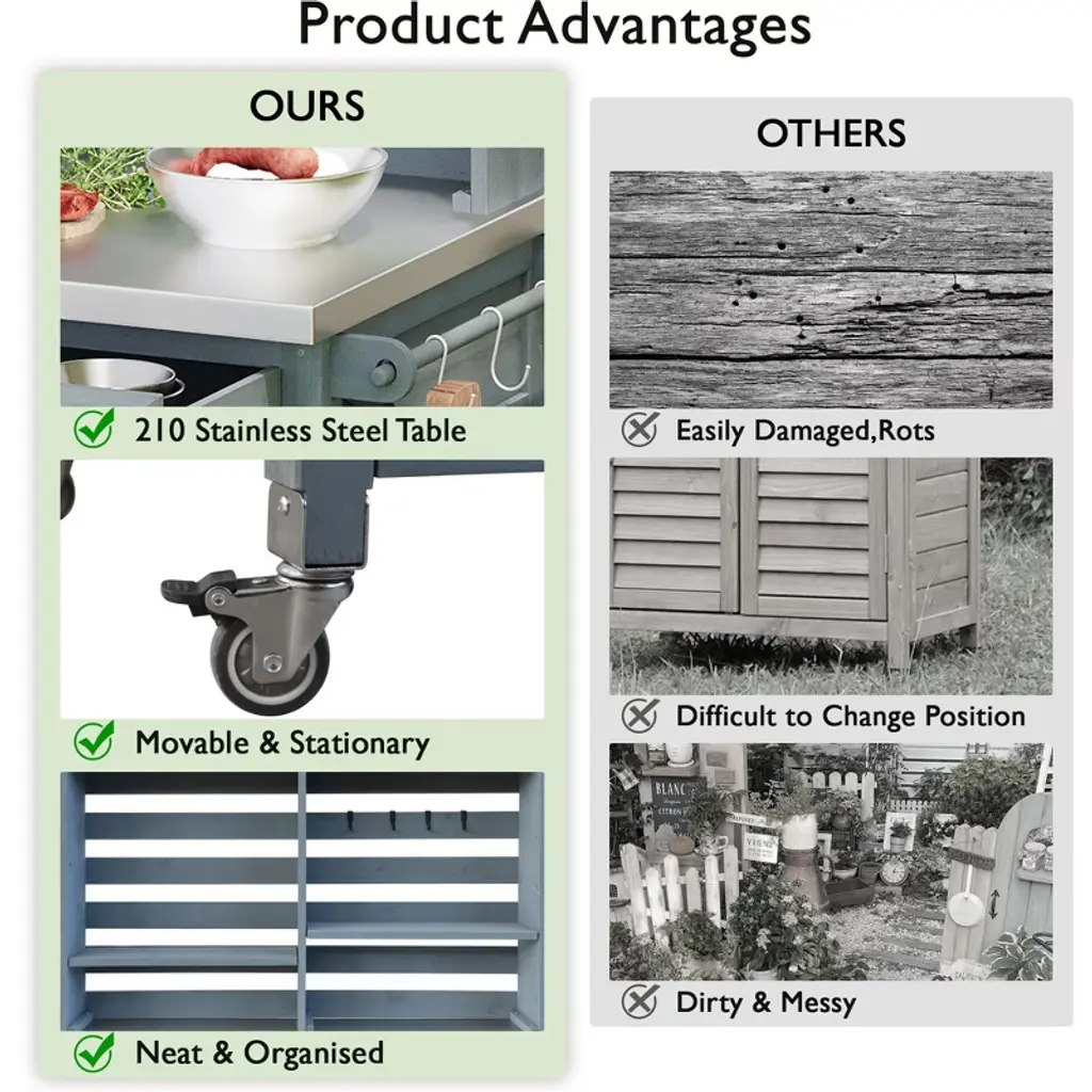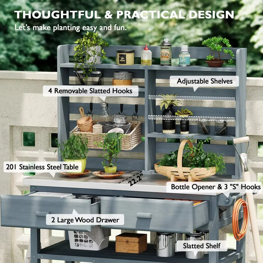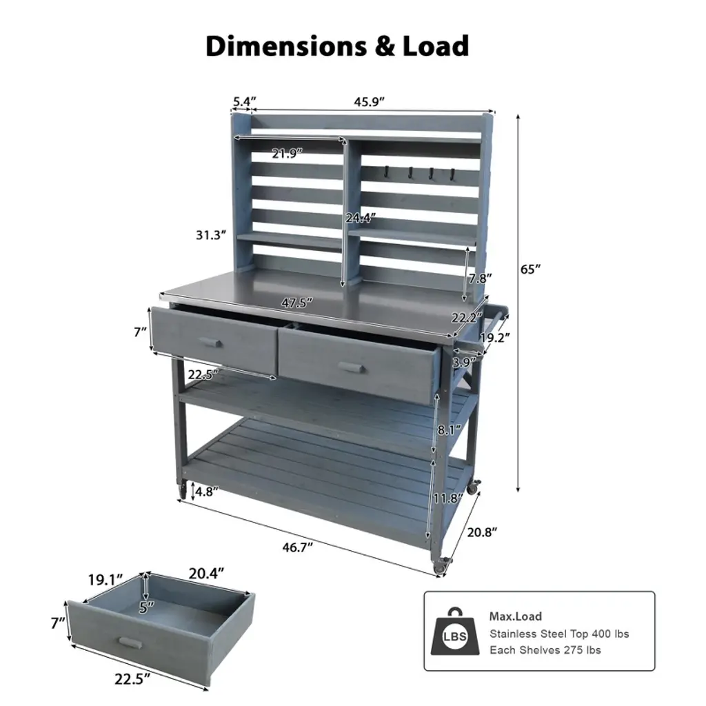 Elevate your gardening and outdoor kitchen experience with this 64.9" outdoor potting bench, designed for both functionality and durability. Crafted from 100% premium fir wood, it offers a natural aesthetic while ensuring skin-friendly use with minimal chemical treatments. The spacious 47.5" x 22.2" stainless steel tabletop provides an easy-to-clean, weather-resistant work surface, perfect for gardening, meal prep, or serving guests. Thoughtfully designed with ample storage, it features two large drawers, dual lower slatted shelves, and an elevated hutch with adjustable side shelves for ultimate organization. Additional details like removable S-hooks, a towel rack, and a propane tank mounting position enhance its versatility. With four lockable wheels for stability and easy mobility, this potting bench adapts to different outdoor conditions, making it an essential addition to any garden, patio, or outdoor kitchen setup.
