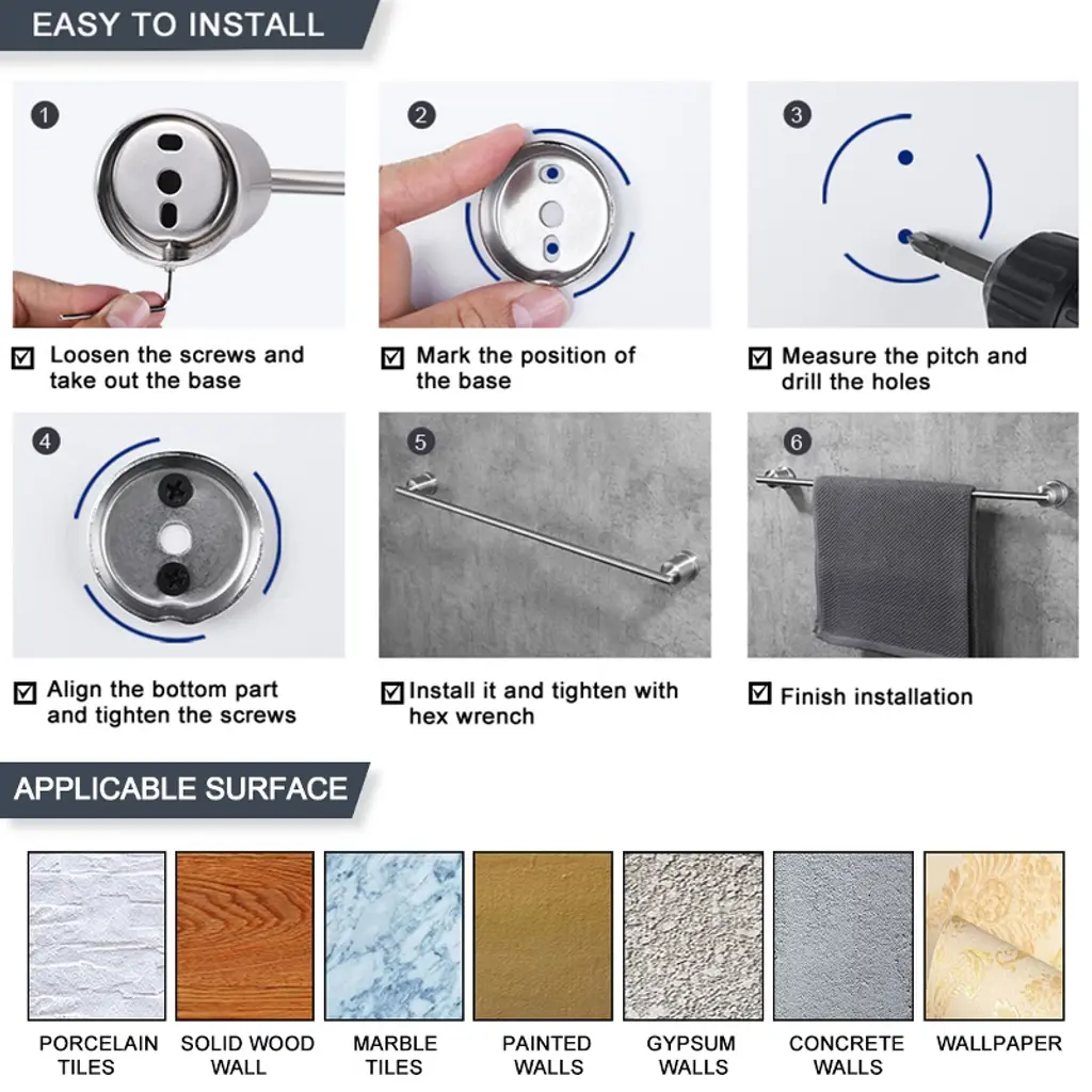 The modern wall-mounted bathroom towel rack is resistant to fingerprints, corrosion, and scratches. Concealed screws drilling installation adds beauty to your house, add beauty. The length suitable for the large space of home and hotel, allows you to enjoy a simpler and more convenient life.