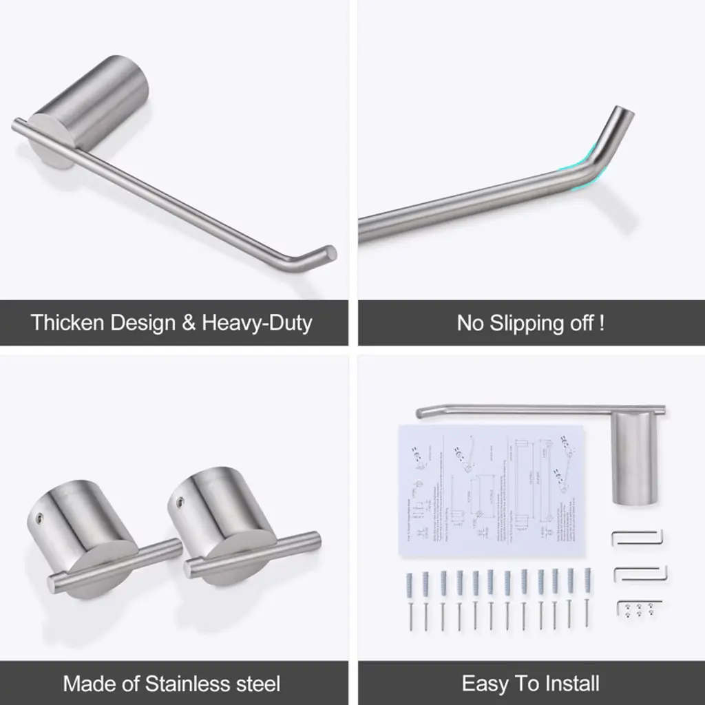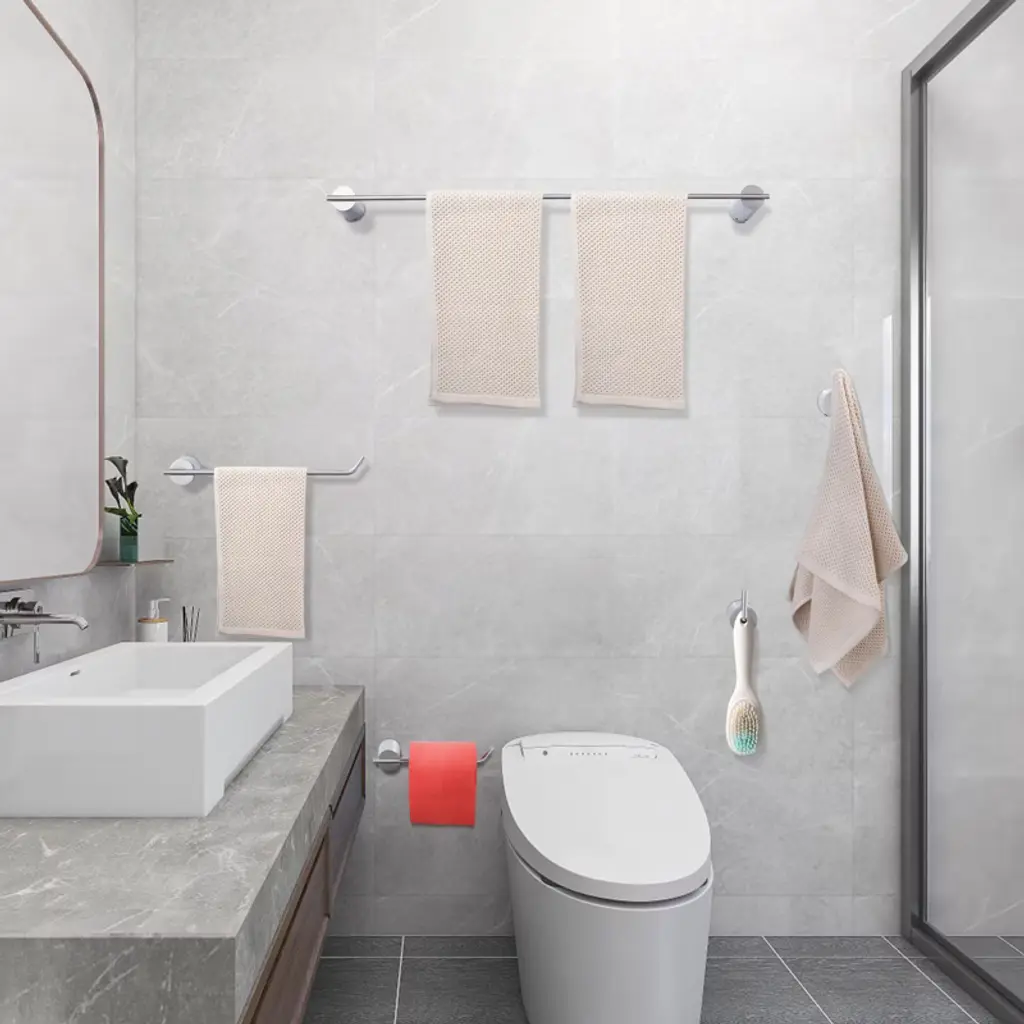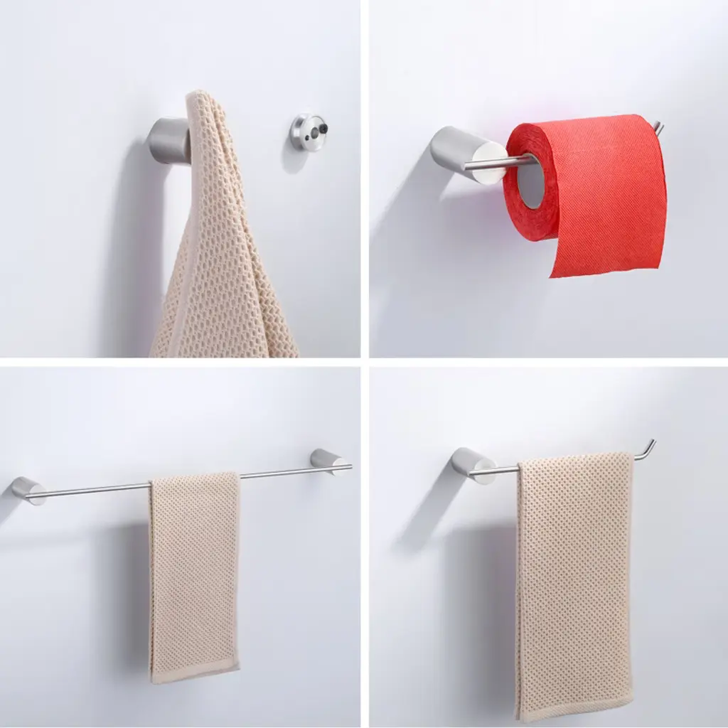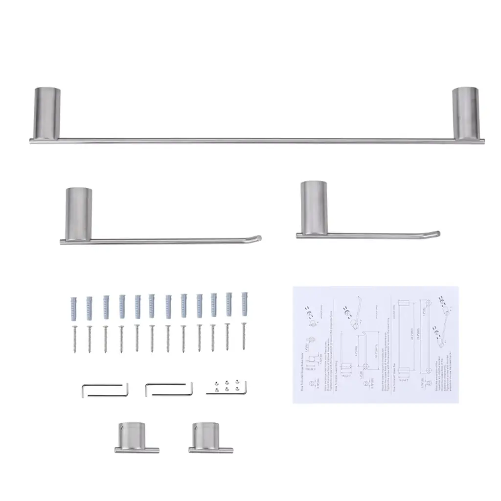 This product consists of 5 bathroom accessories. The long towel bar and short towel rack can hold multiple towels, while the toilet paper holder provides easy storage for rolls. 2 multi-functional hooks offer more hanging options to meet various needs. The installation of this product features a concealed screw design, ensuring stability and its rust-resistant treatment guarantees long-term use in moist environments. The surface of this product is smooth, preventing scratches or damage to towels. It comes with complete installation accessories and an installation manual for your convenience in quickly completing the setup.