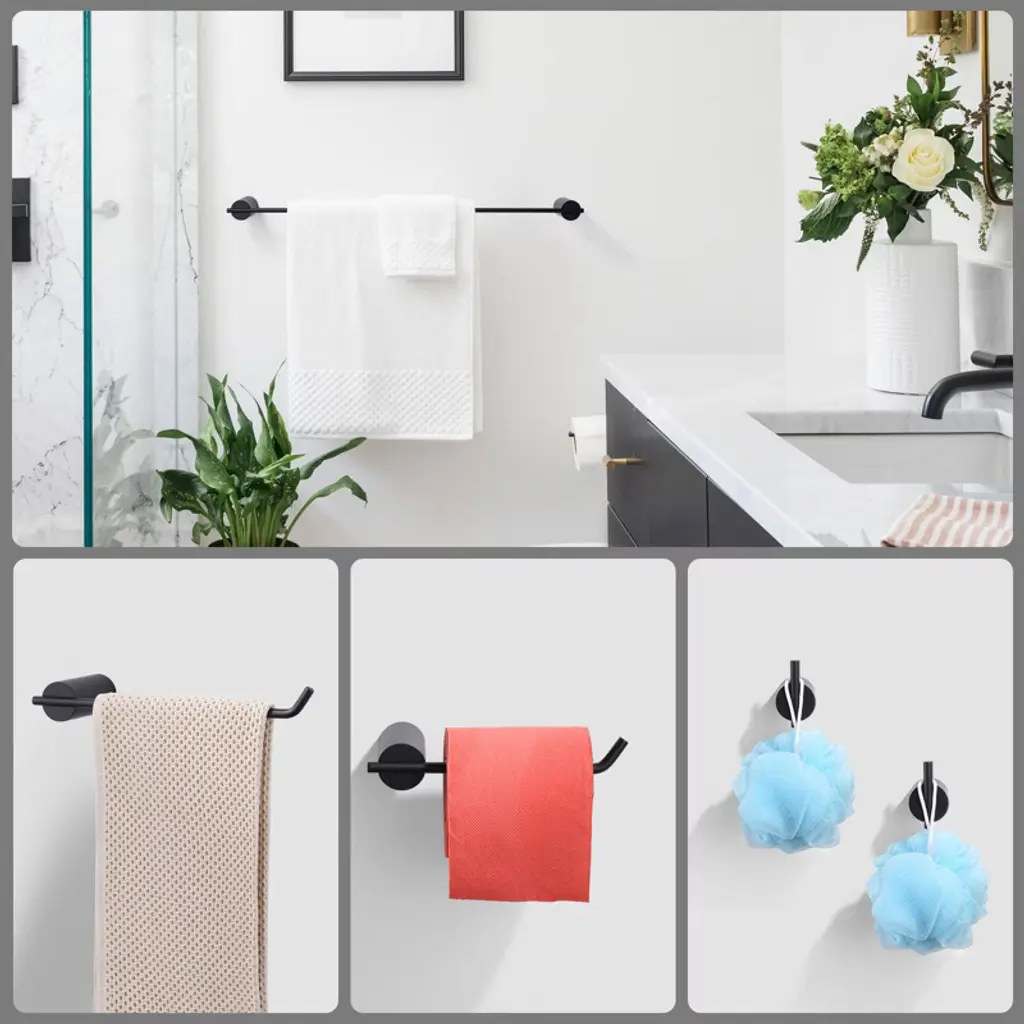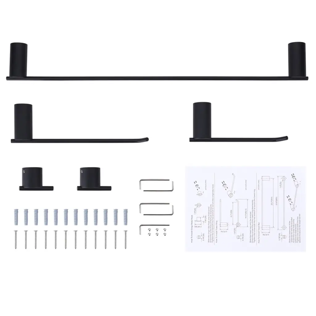 This product consists of 5 bathroom accessories. The long towel bar and short towel rack can hold multiple towels, while the toilet paper holder provides easy storage for rolls. 2 multi-functional hooks offer more hanging options to meet various needs. The installation of this product features a concealed screw design, ensuring stability and its rust-resistant treatment guarantees long-term use in moist environments. The surface of this product is smooth, preventing scratches or damage to towels. It comes with complete installation accessories and an installation manual for your convenience in quickly completing the setup.