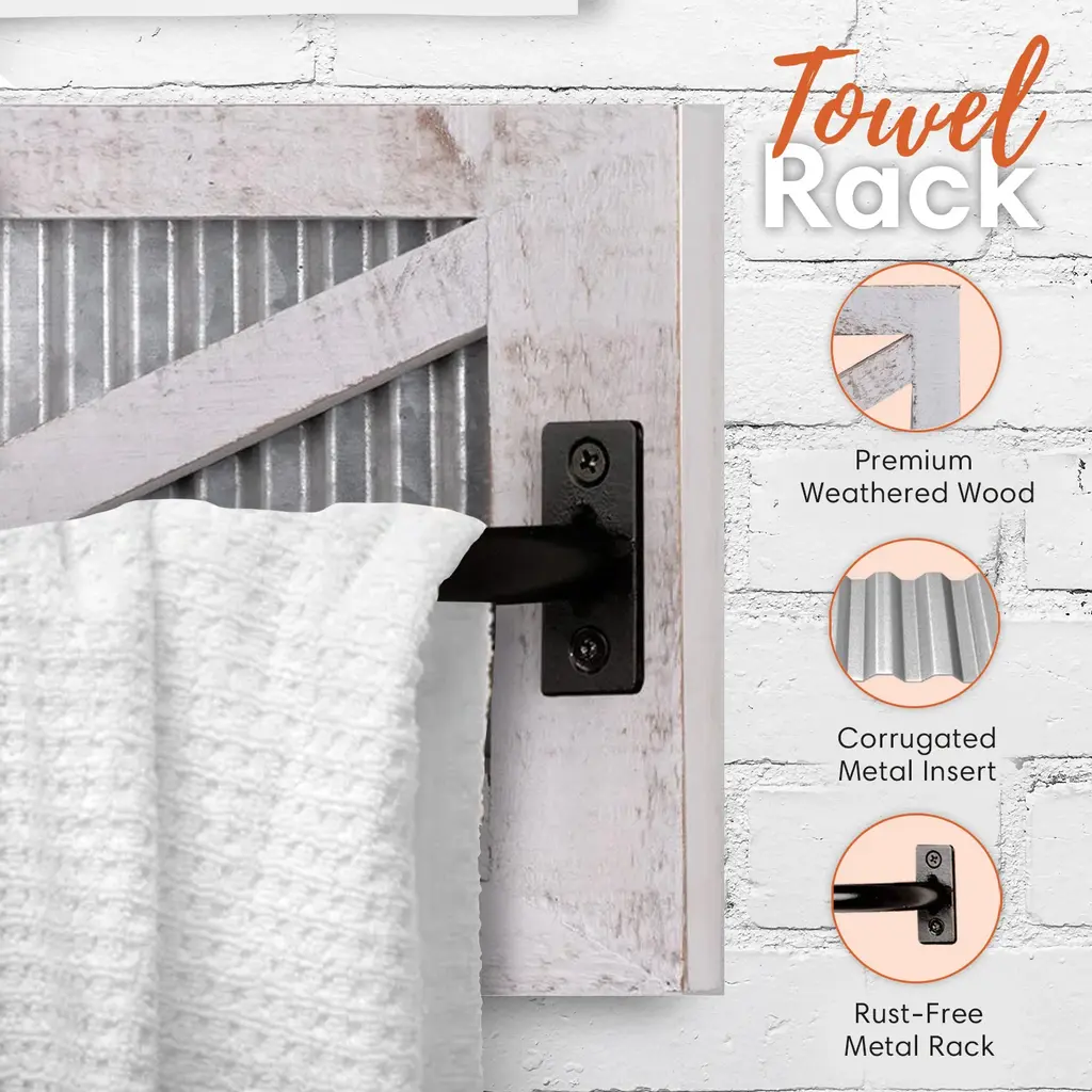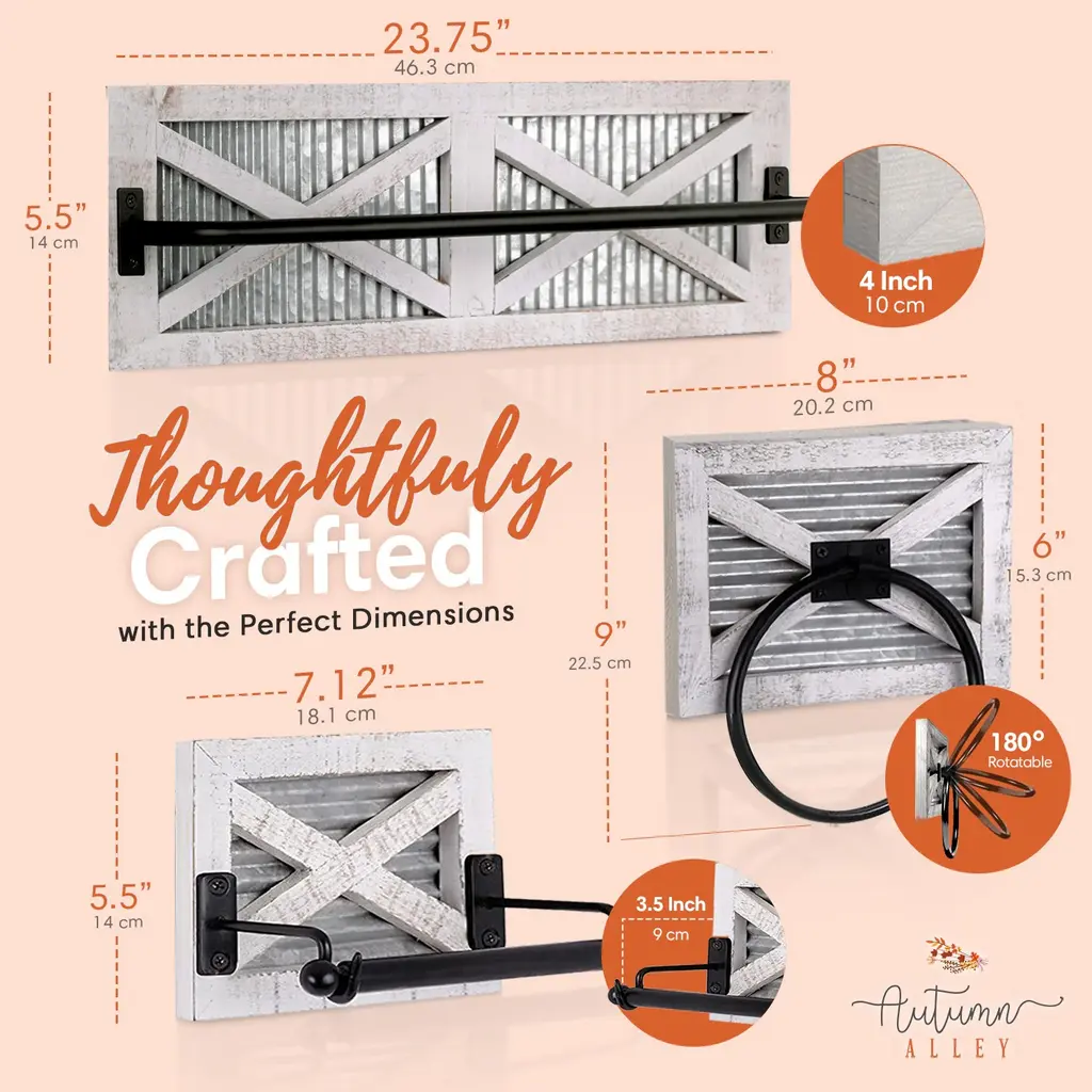 Autumn Alley believes in the perfect blend of form and function. Our Rustic Hand Towel Ring, Toilet Paper Holder, and Rustic Towel Rack Holder for Bathroom are prime examples of how beauty and utility can go hand-in-hand. Featuring a charming blend of weathered wood and corrugated metal, these bathroom accessories are stunning additions to any farmhouse or rustic guest bathroom. The Rustic Towel Rack Holder, along with the Hand Towel Ring and Toilet Paper Holder, create a cohesive and stylish look. The Autumn Alley Barn Door Bathroom Decor accessory line offers a range of coordinating pieces to help you complete your rustic bathroom decor. Our goal is to create unique and captivating pieces that bring joy to your everyday life. Whether you're using them to hang your hand towel or toilet paper, or simply admiring their rustic charm, these bathroom accessories are sure to bring a smile to your face. Choose Autumn Alley for design quality and one-of-a-kind pieces that elevate any living space.
