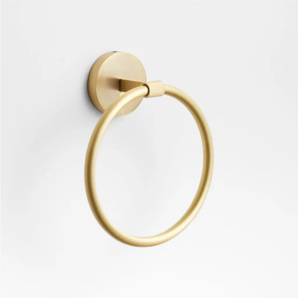Sometimes it's the small things that pull a room together. That's why we've designed a hardware collection with modern silhouettes, clean lines and a touch of tradition to give your bathroom that perfect finishing touch. Made of brushed brass, this towel ring lends industrial chic to its minimalist design. The towel holder threads a perfect circle through a fluted tube that extends from a flat bar anchored to a circular mount for an intriguing mix of rounded edges, smooth surfaces and texture. The hand towel ring easily fastens to the wall with included hardware.