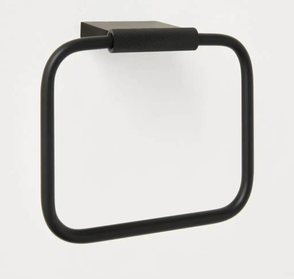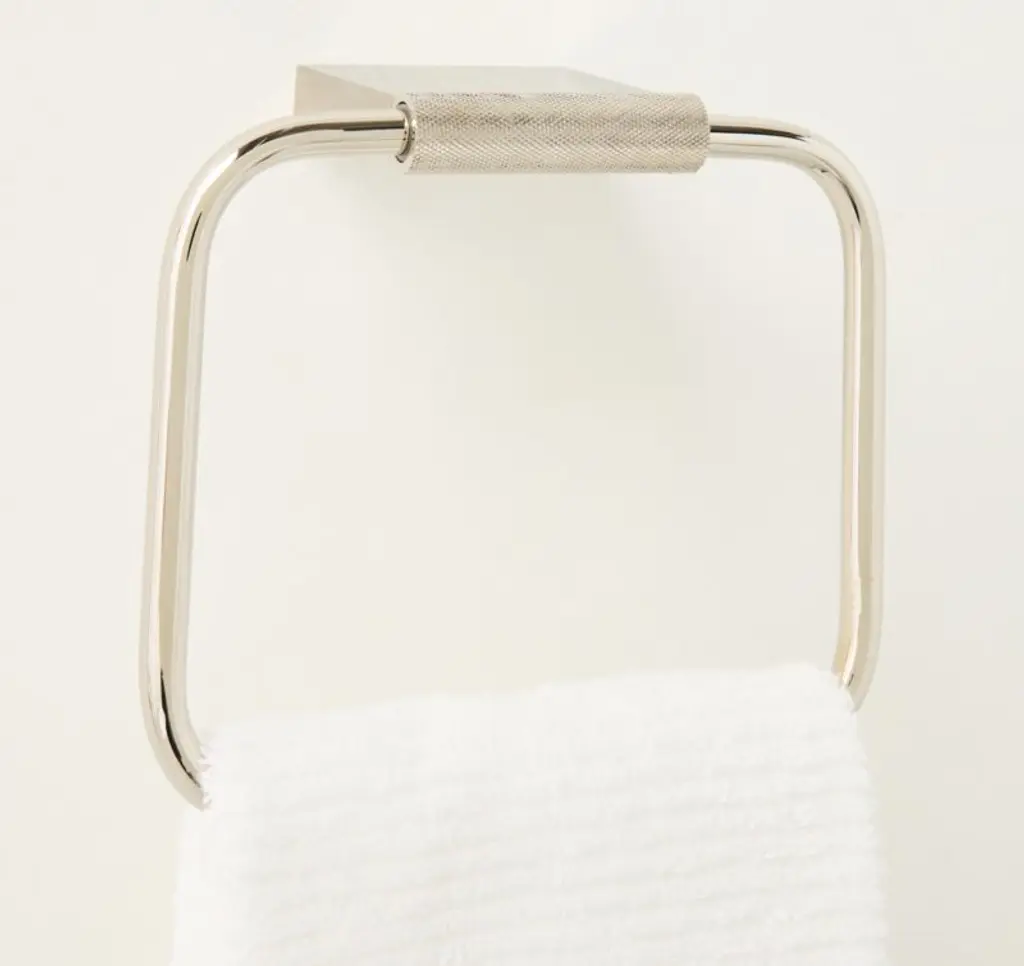 Marked by contrasting textures, knurled towel ring by Mermelada Estudio lends a sleek industrial look. Knurling technique creates a diamond pattern across the surface for a better grip. CB2 exclusive.
