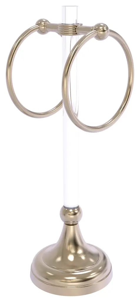 Add an interesting design element to your bathroom with this free standing guest towel stand. It has hanging rings to hold two hand towels conveniently next to the sink. Its classic traditional style will complement your decor and with a weight in the base it will stay stable on the countertop. Made from all solid brass, this decorative accessory will provide a lifetime of use.Crafted from the finest solid brass materials2 towel rings designed to hold hand towelsAcrylic components subtly accentuate this elegant designFelt pad will prevent scratching on any surfaceWeighted base will keep this item secure on your counter topProvided with a Limited lifetime warrantyAntique Pewter, a rich dark gray matte finish