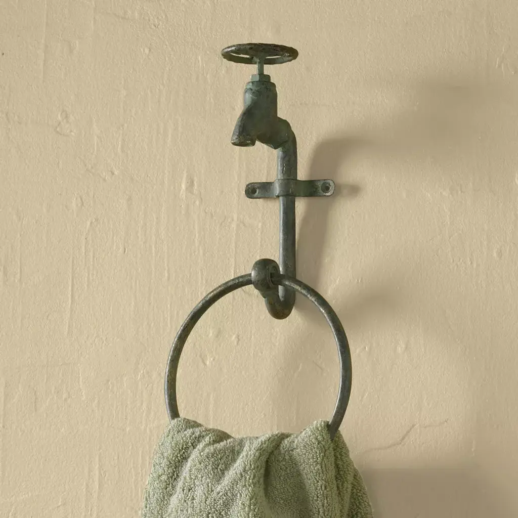 This stunning rustic water faucet shaped towel holder looks great in any kitchen or bathroom. Made from beautiful and durable aluminum with a green patina and slight copper finish. It has dual mounting holes and is easy to install, thanks to the included mounting screws and wall anchors. Whether you are trying to display your favorite dishtowel, or just need a holder for a hand towel to dry your hands on, this the perfect addition to any bathroom, kitchen, or just about any room and fits seamlessly into many home decor styles like lodge, country, rustic, farmhouse, cabin, and many more! Makes for an excellent gift for birthday, wedding, anniversary and especially housewarming!