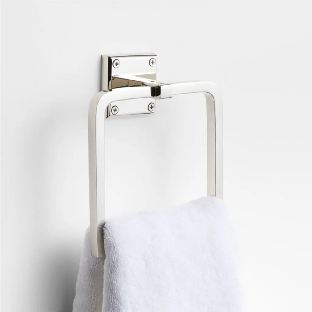 Sometimes it's the small things that pull a room together. That's why we've designed a hardware collection with modern silhouettes, clean lines and a touch of tradition to give your bathroom that perfect finishing touch. Rounded corners and smoothed edges soften the minimalist design of the hand towel ring made of brass finished in brushed nickel. The towel holder threads an open, stirrup-shaped square through a rectangular rod affixed to a square wall plate for a look that's bold and geo-focused. Included hardware makes it easy to mount the towel ring on the wall for an instant bath refresh.