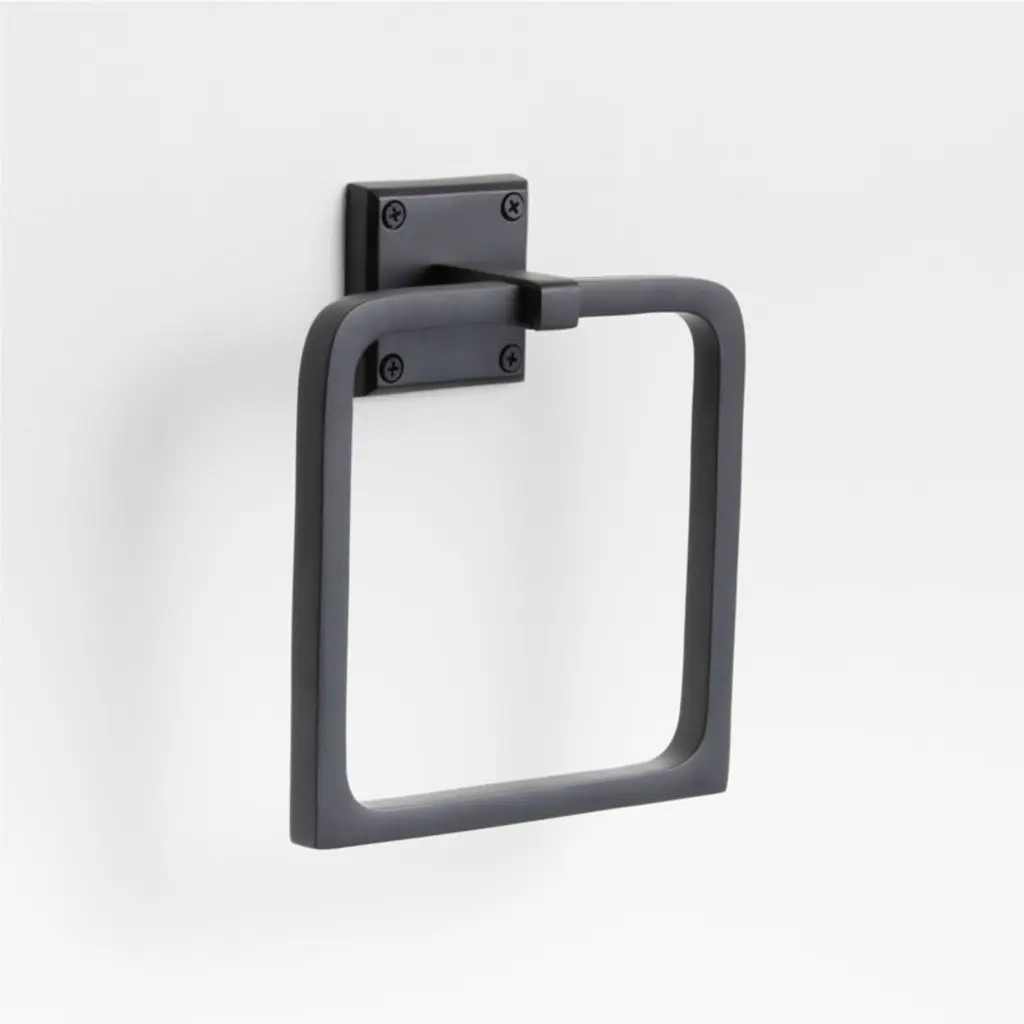 Sometimes it's the small things that pull a room together. That's why we've designed a hardware collection with modern silhouettes, clean lines and a touch of tradition to give your bathroom that perfect finishing touch. Rounded corners and smoothed edges soften the minimalist design of the hand towel ring made of matte black-finished brass. The towel holder threads an open, stirrup-shaped square through a rectangular rod affixed to a square wall plate for a look that's bold and geo-focused. Included hardware makes it easy to mount the towel ring on the wall for an instant bath refresh.