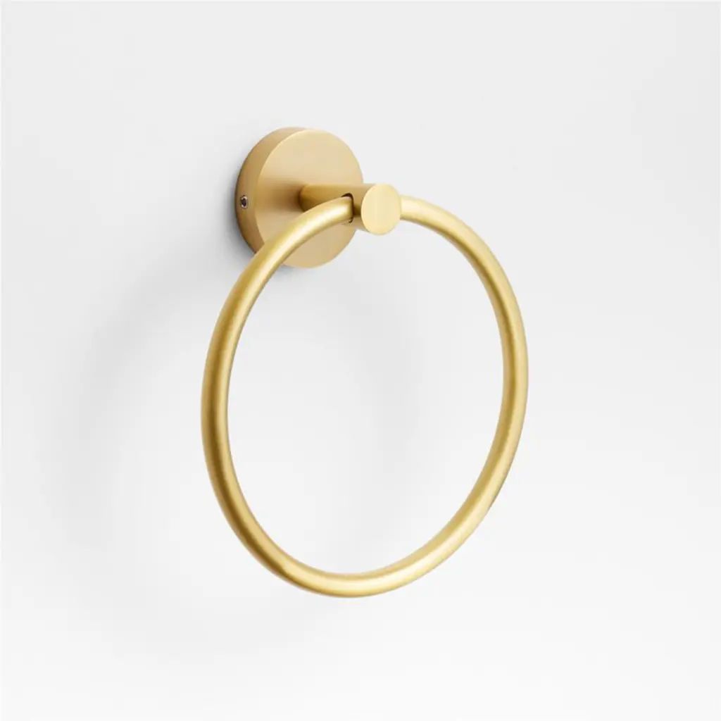 Sometimes it's the small things that pull a room together. That's why we've designed a hardware collection with modern silhouettes, clean lines and a touch of tradition to give your bathroom that perfect finishing touch. Made of brass with a brushed finish, the stylish hand towel ring threads a perfect circle through a tapered cylindrical rod grounded by a scaled-up round rosette base. The result is a functional towel rack with a graphic look and modern proportions for an instant bathroom refresh. The towel ring is ready to mount on the wall with included hardware.