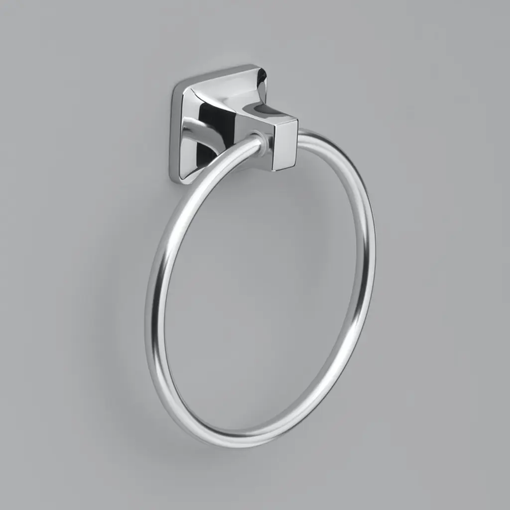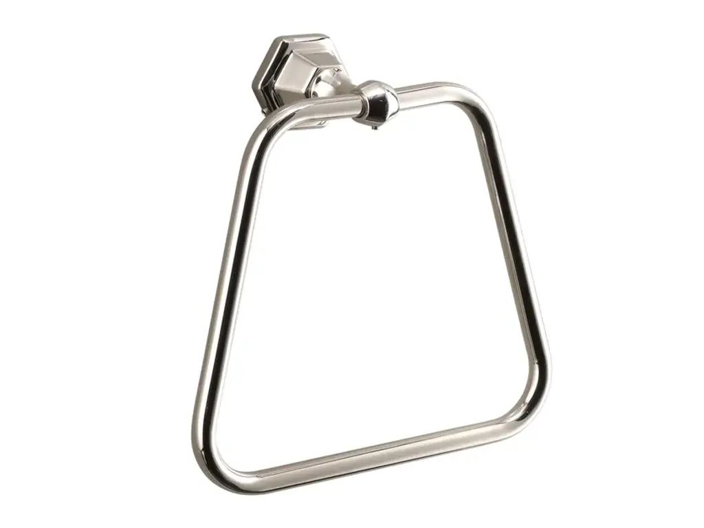 TIME is a refined turned brass towel ring. Retro elegance which pays homage to the expert geometrical proportions of the American modernism.The Time collection of taps is inspired by 1930s American Art Deco and follows that characteristic in aesthetic taste, architectural proportions and simplicity of form. Every piece in the collection features geometrical lines, facetted, reflecting surfaces and a “monolithic” robustness, unmistakeably recalls the sophisticated atmosphere of the Modernist style. The Time collection consists of: three-hole washbasin and bidet set, single-hole for bidet, wall-mounted bath-tub set, deck-mounted bath-tub tap set, free-standing legs and three-hole shower mixer with plate.Available in the following finishes: chrome, light gold, polished nickel and satin nickel.