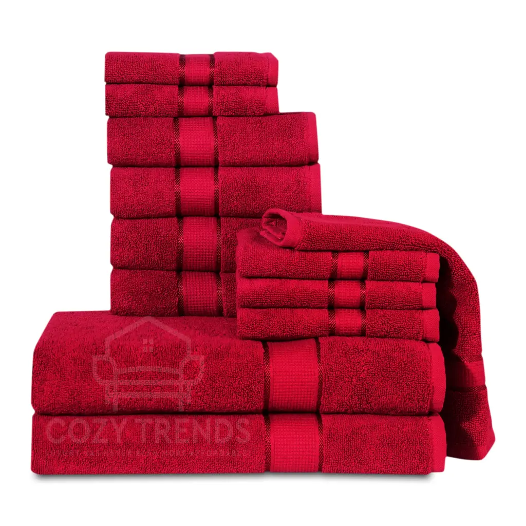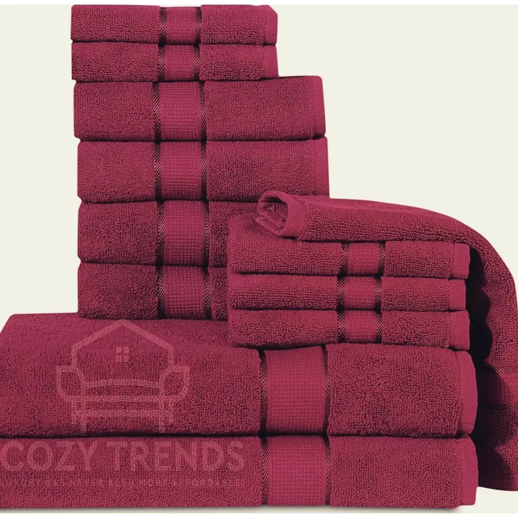 Experience ultimate comfort and luxury with our 12 Piece Towel Set made of 100% long-staple combed cotton with a high GSM of 600. This set includes two matching bath towels, four hand towels, and six washcloths, each providing maximum absorbency and quick drying. The towels are woven on high-tech Jet looms and reinforced with a strong double-stitch edge, ensuring durability and resistance to tearing. The luxury double dobby on hem borders adds an elegant touch to these fade-resistant towels. With natural dyes and no chemicals, they are eco-friendly and soft to the touch. These towels are completely machine washable and bleach safe, and become even plusher after each wash. Enjoy the ease of care and our satisfaction guarantee, or return your order for a full refund within 30 days.Features: