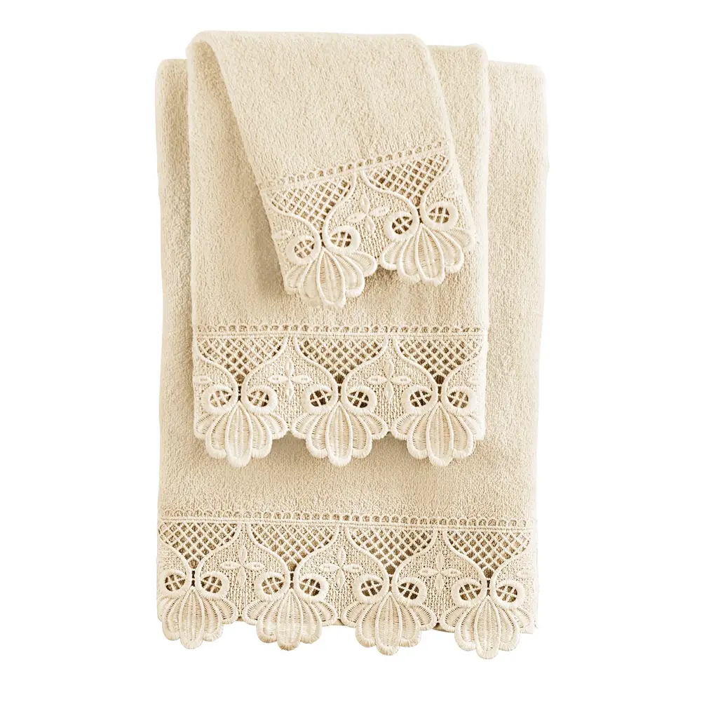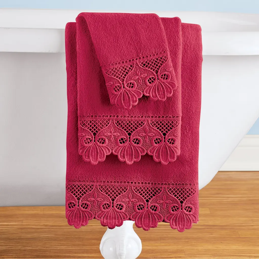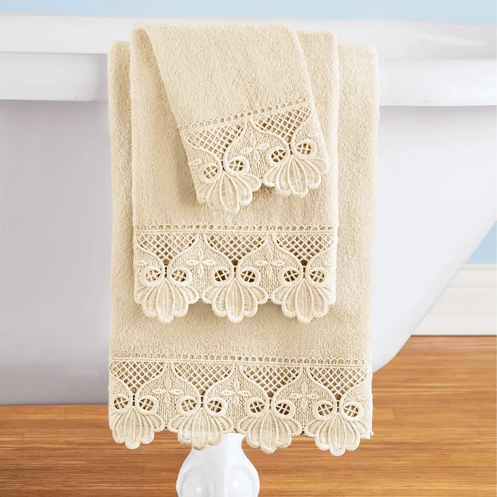 Each of the towels in this beautiful set is trimmed with a border of elegant macramé lace along the bottom. The 3-piece set is available in 4 lovely colors to match any décor. Machine wash. Cotton; imported. Bath towel is 44"L x 22"W, hand towel 23"L x 15"W and washcloth is 11"Sq. Choose: Lavender, Blue, White or Sage. 3-Piece Set.