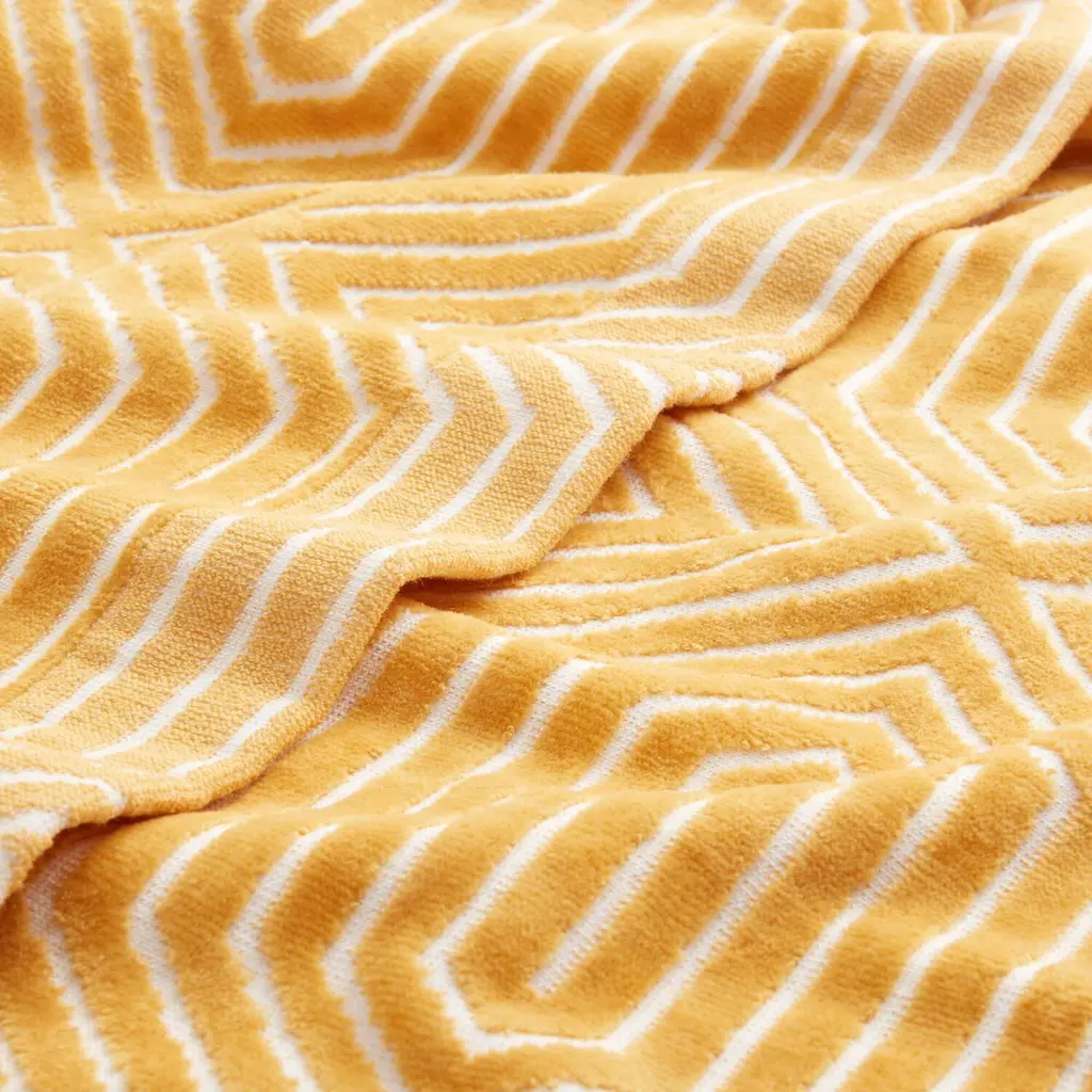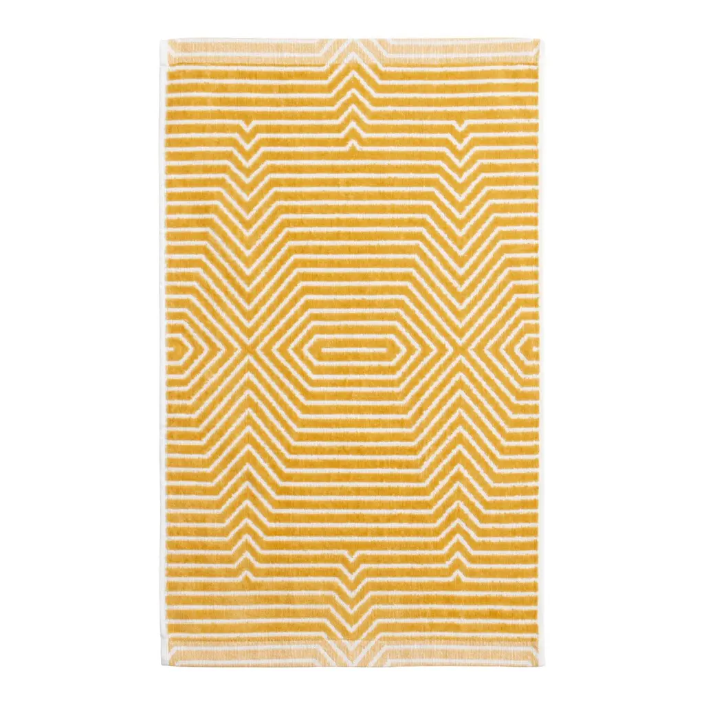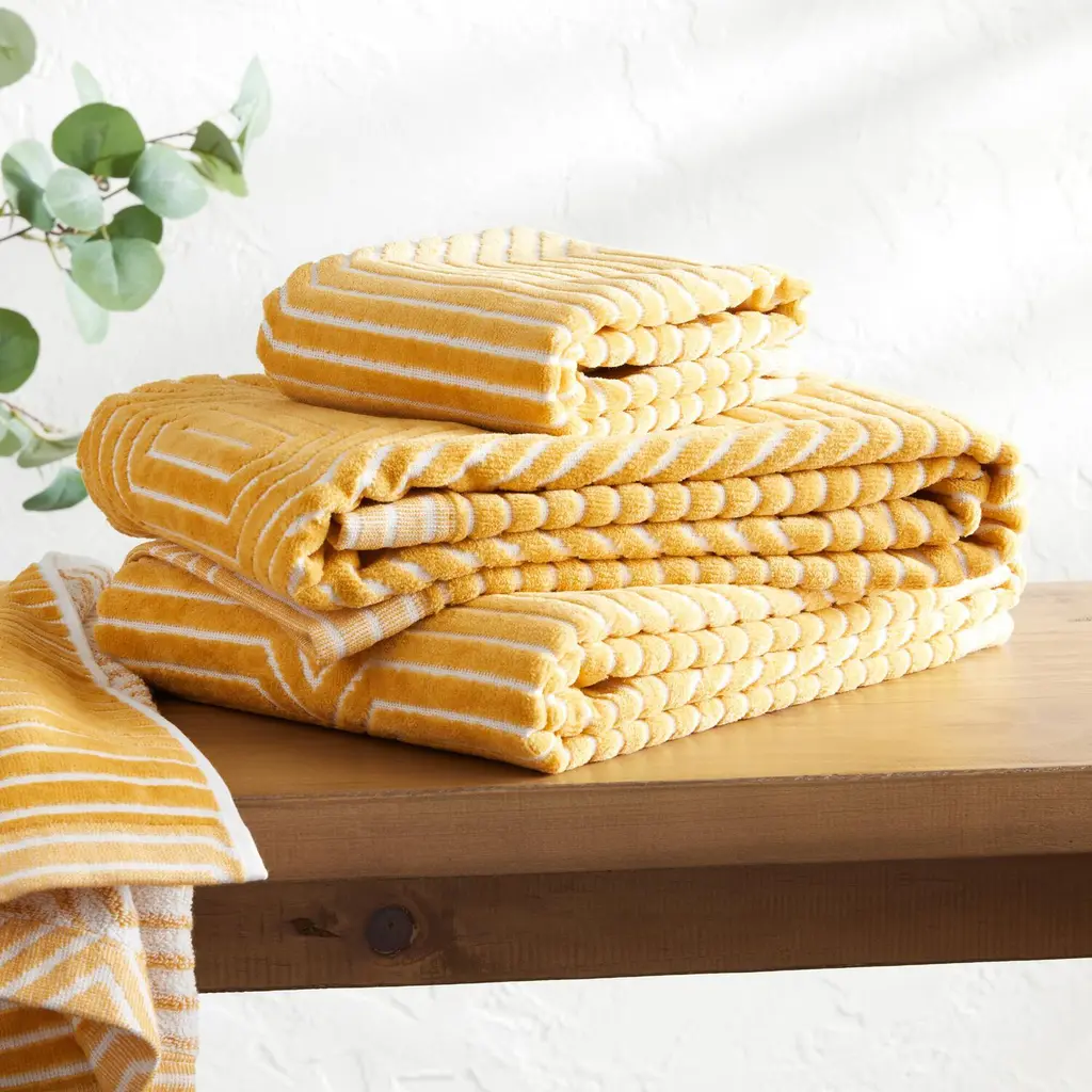 Made of superbly soft cotton, our exclusive towel collection updates any bathroom with a sculpted geometric line design. These mustard-yellow and white hand and bath towels are a delight to wrap yourself up in and make a modern decor display.