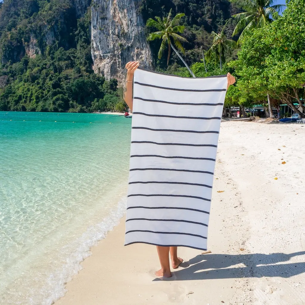 The Arkwright Las Rayas 4-Piece Beach Towel set includes plush towels that are made from 100% ring spun cotton and feature beautiful flat-woven horizontal stripes. This luxury bath towel set of four is thick, soft, and absorbent. Our white beach towels wick water away fast and are considered a quick dry towel. These luxury towels are beach, pool, or bath towels for adults. Optically bright white fluffy towels with sophisticated, colorful bath towel stripes. Whether you're looking for hotel towels for bathrooms, spa towels, hotel spa towels, personal shower towels, travel beach towels, swim towels for your pool, or just a decorative bath towel, Las Rayas is one luxury towel that you cannot ignore. These towels can be machine washed in a regular cycle with like colors. Set of four towels Vibrant horizontal stripes 100% Cotton Machine Washable