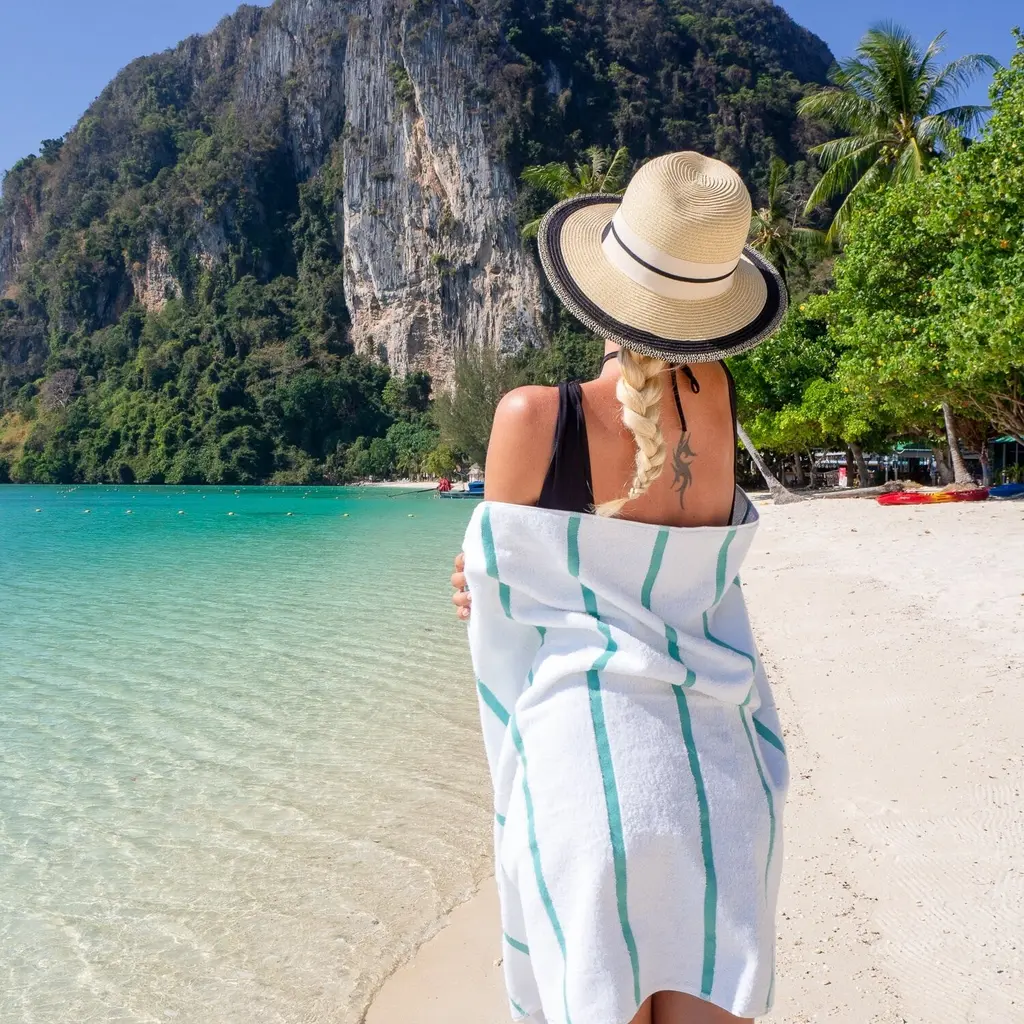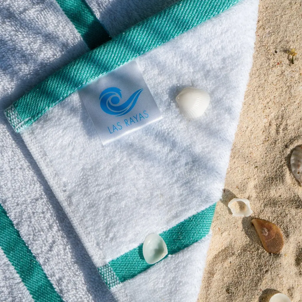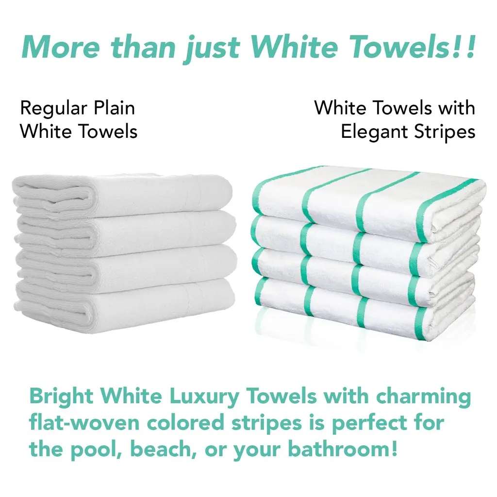 The Arkwright Las Rayas 4-Piece Beach Towel set includes plush towels that are made from 100% ring spun cotton and feature beautiful flat-woven horizontal stripes. This luxury bath towel set of four is thick, soft, and absorbent. Our white beach towels wick water away fast and are considered a quick dry towel. These luxury towels are beach, pool, or bath towels for adults. Optically bright white fluffy towels with sophisticated, colorful bath towel stripes. Whether you're looking for hotel towels for bathrooms, spa towels, hotel spa towels, personal shower towels, travel beach towels, swim towels for your pool, or just a decorative bath towel, Las Rayas is one luxury towel that you cannot ignore. These towels can be machine washed in a regular cycle with like colors. Set of four towels Vibrant horizontal stripes 100% Cotton Machine Washable