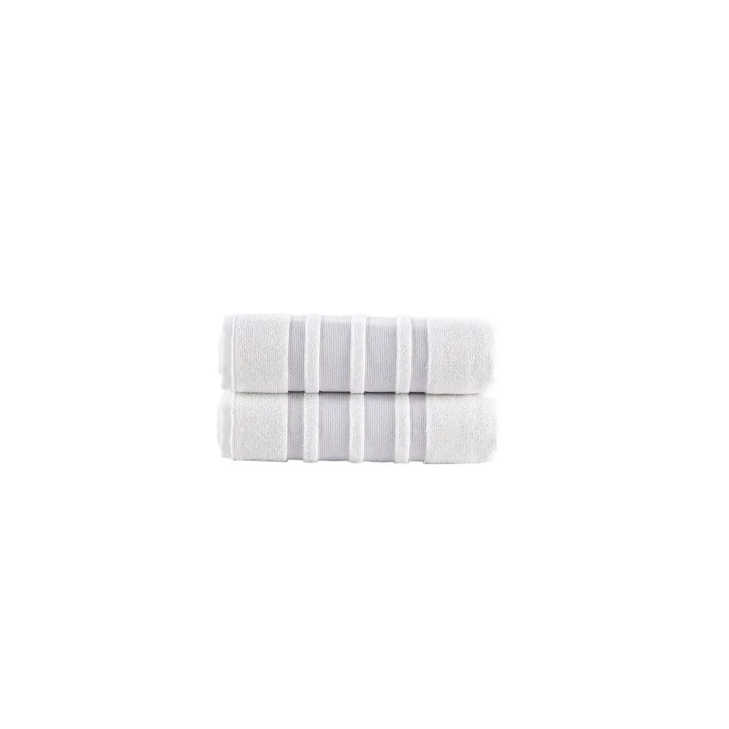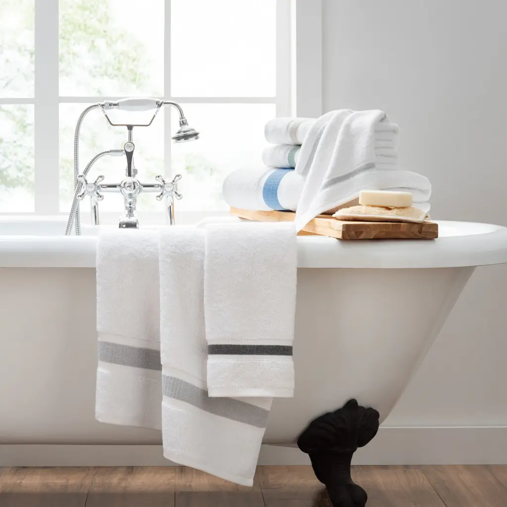 The Aegean Recycled Striped Towel Collection embodies refined Turkish quality in a sophisticated, yet sustainable collection made with 50% eco-friendly recycled cotton. This fine recycled cotton blend yarn, when woven, makes a plush, absorbent bath towel. Renewable for the environment and restorative for your body — fine recycled bath towels from Aston & Arden. Ring spun cotton is a process of twisting, spinning, and stretching long, high-quality cotton fibers into yarn finer, softer cotton yarns. Mixing new high-quality cotton with high-quality eco-friendly recycled cotton fibers creates new cotton that is undetectable as recycled. Our Aegean eco-friendly recycled cotton towels were designed with thoughtful features, pristine white towel with color stripe border, a low-twist weave, extra strong hemmed edges, and a unique textured woven stripe dobby. Features:Dimensions: