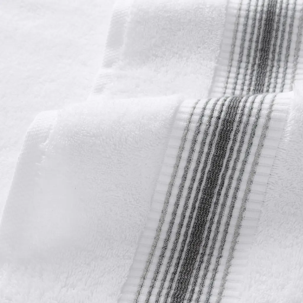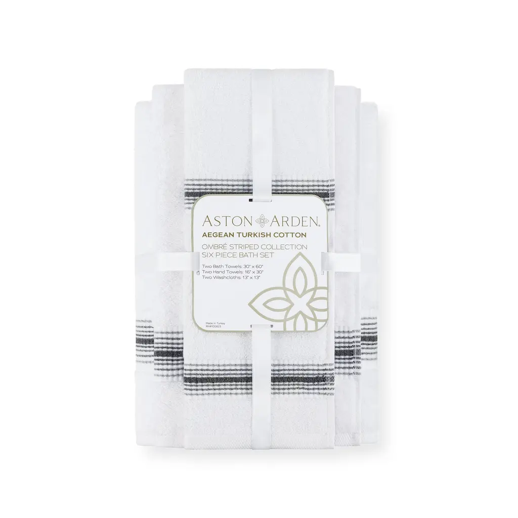 The Aston & Arden Collection of fine textiles marries inspired design and sophisticated style with superior materials and master craftsmanship. Aston & Arden Towels are luxury incarnate. Made in Turkey from the best quality Aegean Turkish cotton, our extra-large towels are soft and sensuous for an elegant spa experience at home. Wrap yourself in this plush 600 GSM towel and experience the 5-Star Hotel quality of 100% Premium Turkish Cotton. These towels are crafted with meticulous attention to detail, ensuring every loop is perfectly formed for maximum absorbency and a luxurious feel. Our towels are made from ""spinning"" long-staple cotton fibers into superior, soft, and durable yarns. This process creates a towel that is not only incredibly soft but also durable enough to withstand daily use and frequent washing. The long-staple fibers of Aegean cotton are prized for their ability to produce a smoother and stronger yarn, resulting in a towel that remains plush and luxurious over time. The Aston & Arden 6-Piece Set includes two bath towels, two hand towels, and two washcloths. All feature a unique ombre gradient-striped dobby border that adds a touch of elegance to the pristine white terry body. The ombre design is inspired by natural seaside tones, including Slate Grey, Pewter Grey, and Crystal Blue, making these towels not just functional but also a beautiful addition to any bathroom décor. Experience the superior quality and craftsmanship of Aston & Arden Towels, where every detail is designed to provide you with the ultimate in comfort and luxury. Whether you're stepping out of a relaxing bath or simply drying your hands, these towels offer an unparalleled level of softness and absorbency that transforms everyday routines into a lavish experience.