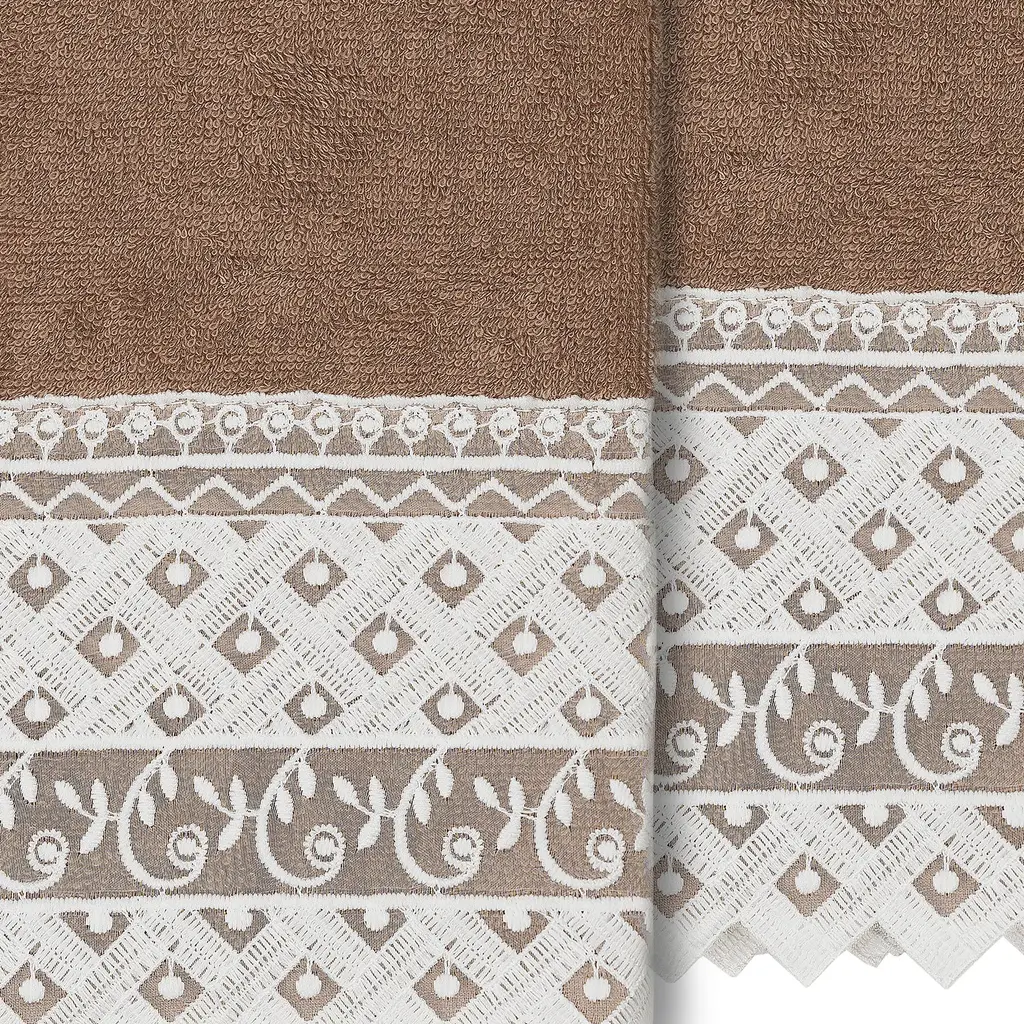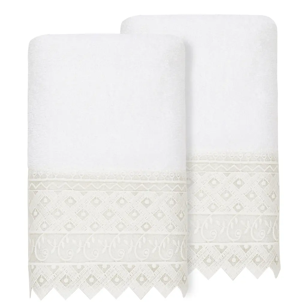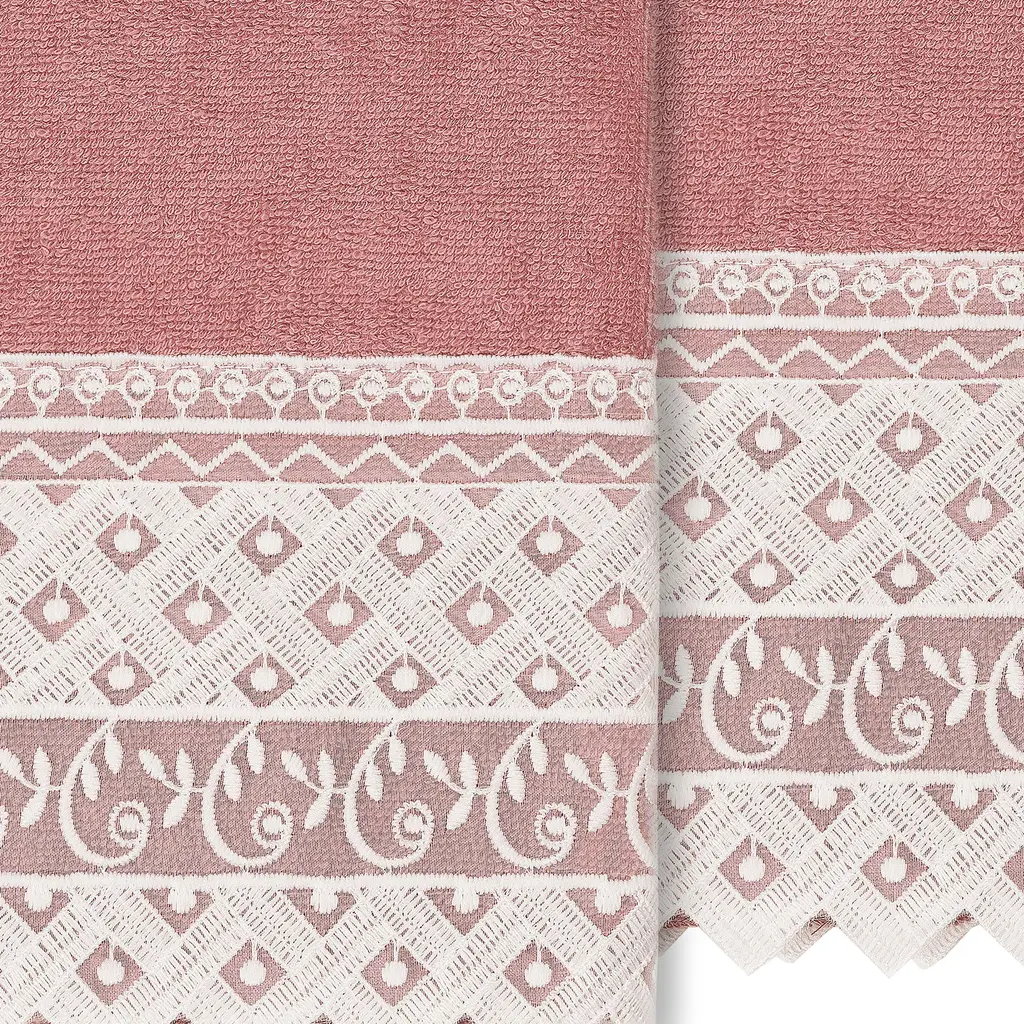 Authentic Hotel And Spa 100% Turkish Cotton Aiden 2Pc White Lace Embellished Hand Towel Set - Tea Rose