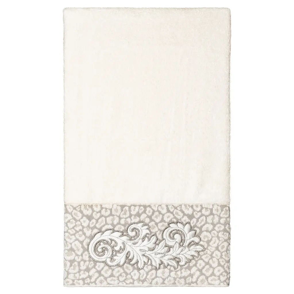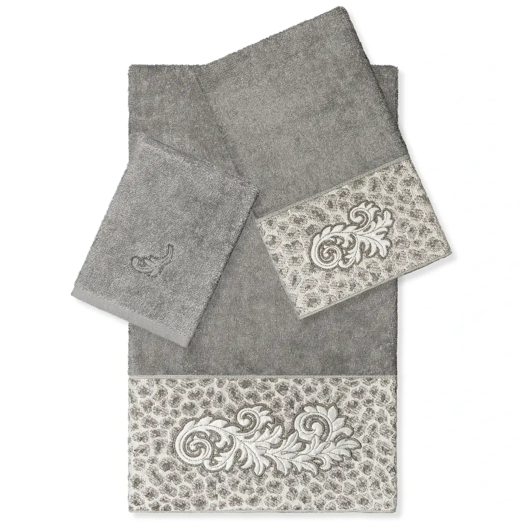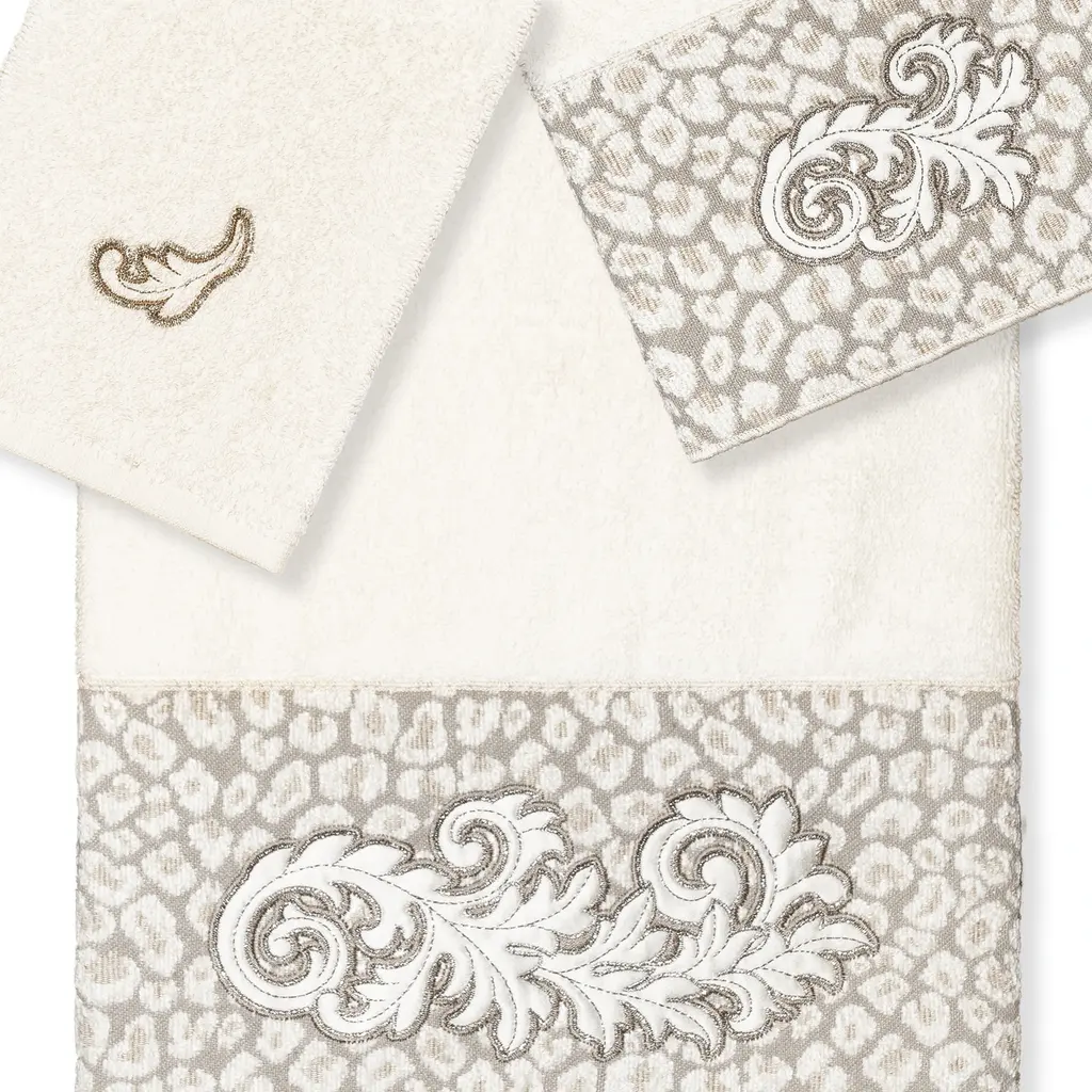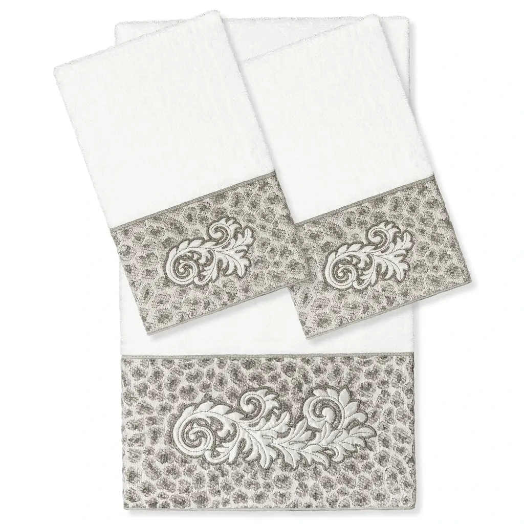 The April Embellished Towel Collection features an elegant lustrous appliqué scroll motif, embroidered on a plush cheetah patterned border. These soft and luxurious towels are made of 100% premium Turkish Cotton and offer lasting absorbency and superior durability. 100% Premium Turkish Cotton Superbly absorbent and quick drying Available in a range of lovely towel colors Machine wash cold, No bleach, line dry or dry clean Set includes 1 bath towel (27" x 54") / 1 hand towel (16" x 30") / 1 washcloth (13" x 13") Embellished in USA Made in Turkey