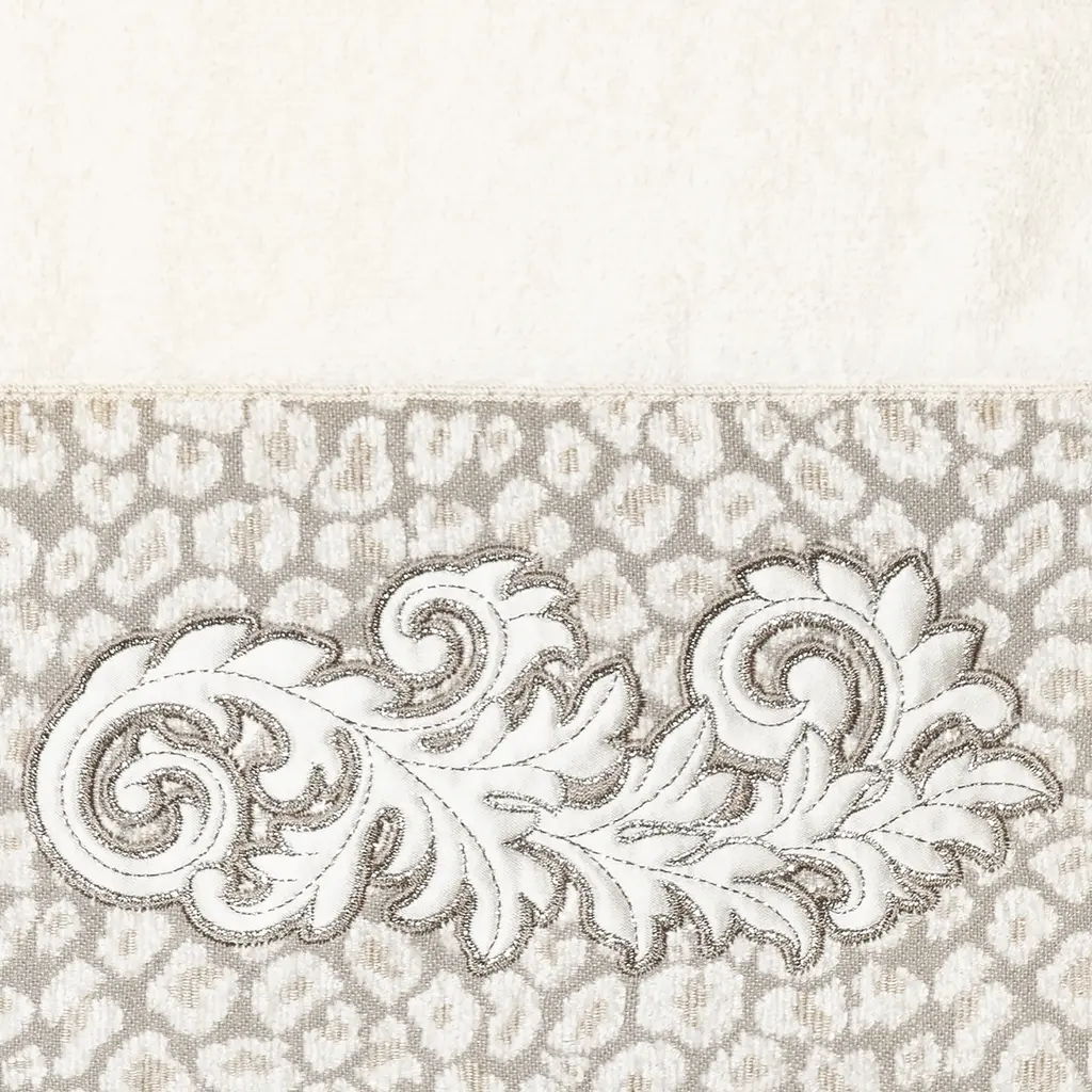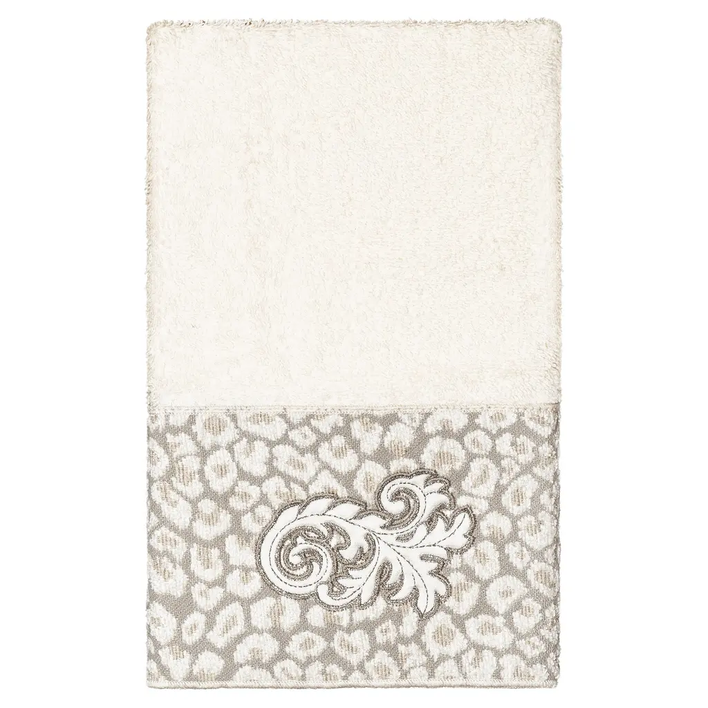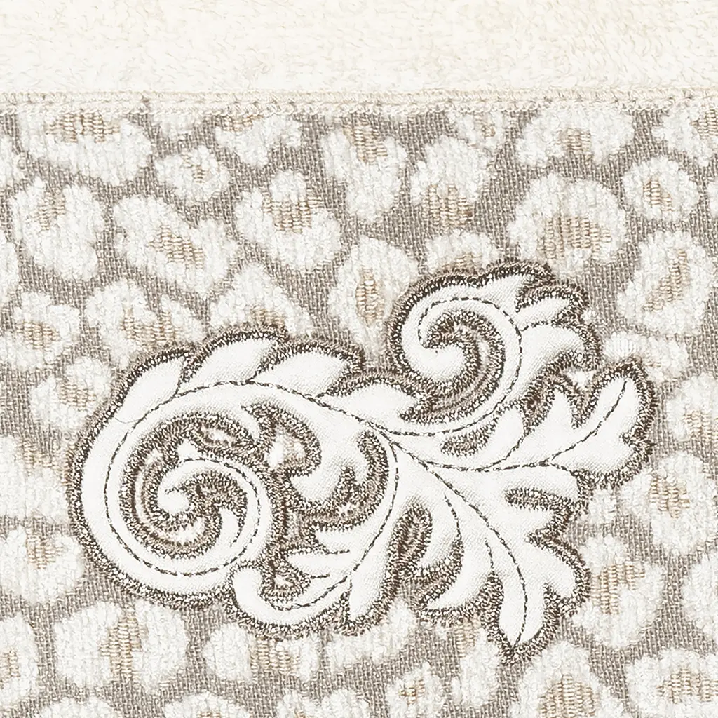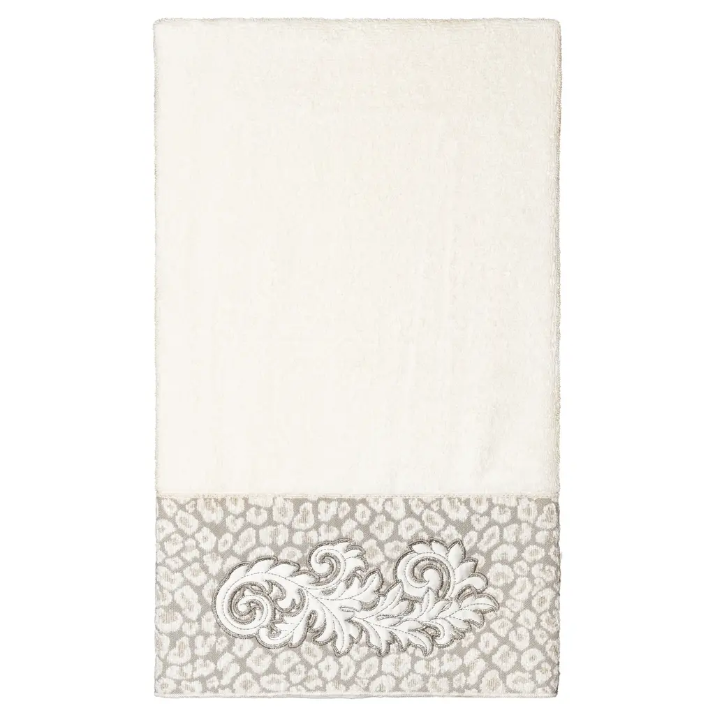 The April Embellished Towel Collection features an elegant lustrous appliqué scroll motif, embroidered on a plush cheetah patterned border. These soft and luxurious towels are made of 100% premium Turkish Cotton and offer lasting absorbency and superior durability. 100% Premium Turkish Cotton Superbly absorbent and quick drying Available in a range of lovely towel colors Machine wash cold, No bleach, line dry or dry clean Set includes 1 bath towel (27" x 54") / 1 hand towel (16" x 30") / 1 washcloth (13" x 13") Embellished in USA Made in Turkey