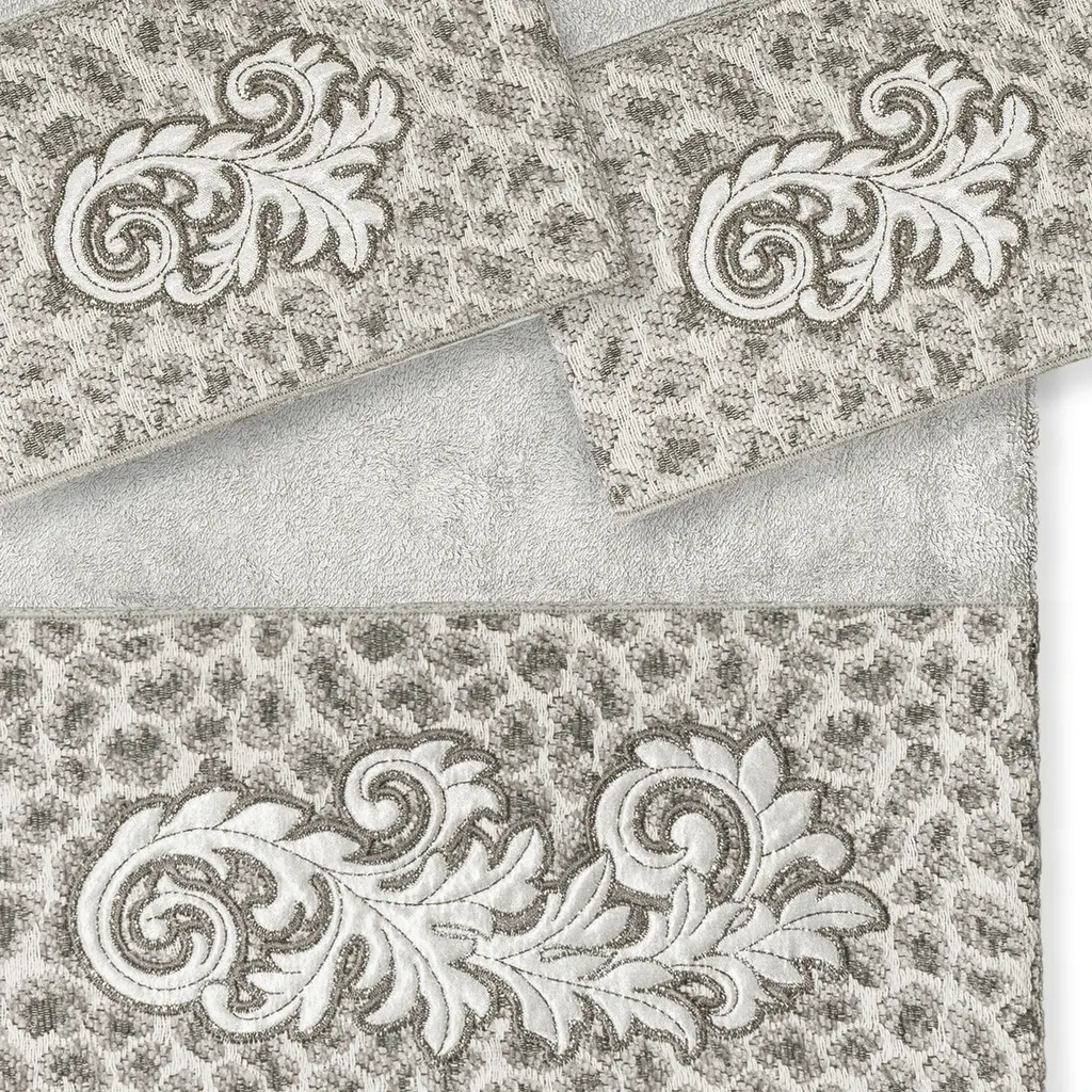 The April Embellished Towel Collection features an elegant lustrous appliqué scroll motif, embroidered on a plush cheetah patterned border. These soft and luxurious towels are made of 100% premium Turkish Cotton and offer lasting absorbency and superior durability. 100% Premium Turkish Cotton Superbly absorbent and quick drying Available in a range of lovely towel colors Machine wash cold, No bleach, line dry or dry clean Set includes 1 bath towel (27" x 54") / 2 hand towels (16" x 30") Embellished in USA Made in Turkey