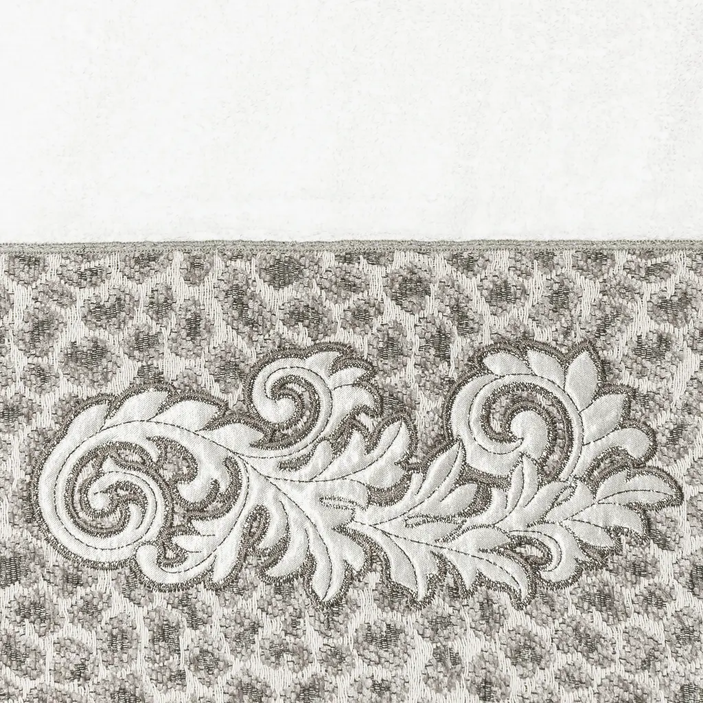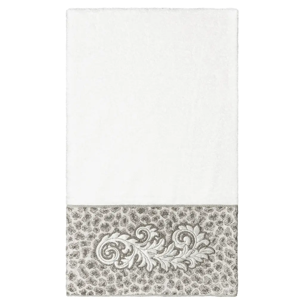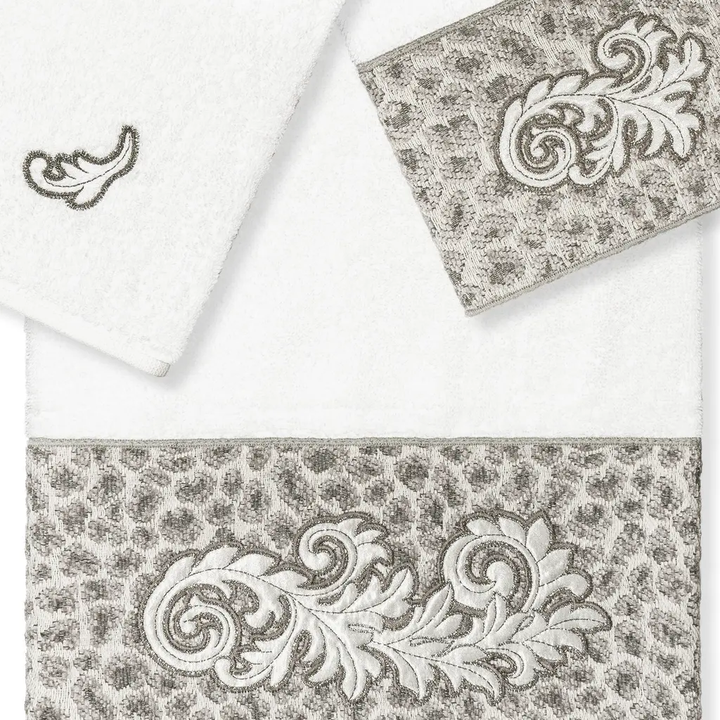 The April Embellished Towel Collection features an elegant lustrous appliqué scroll motif, embroidered on a plush cheetah patterned border. These soft and luxurious towels are made of 100% premium Turkish Cotton and offer lasting absorbency and superior durability. 100% Premium Turkish Cotton Superbly absorbent and quick drying Available in a range of lovely towel colors Machine wash cold, No bleach, line dry or dry clean Set includes 1 bath towel (27" x 54") / 1 hand towel (16" x 30") / 1 washcloth (13" x 13") Embellished in USA Made in Turkey