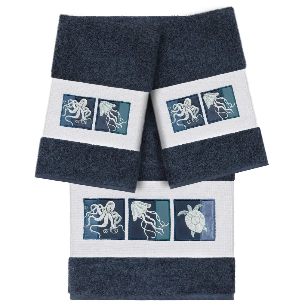 The Ava Embellished Towel Collection features glistening sea creatures framed in colors of the ocean embroidered on a textured woven border. These soft and luxurious towels are made of 100% premium Turkish Cotton and offer lasting absorbency and superior durability. 100% Premium Turkish Cotton Superbly absorbent and quick drying Available in a range of lovely towel colors Machine wash cold, No bleach, line dry or dry clean Set includes 1 bath towel (27" x 54") / 2 hand towels (16" x 30") Made in Turkey