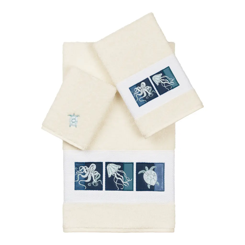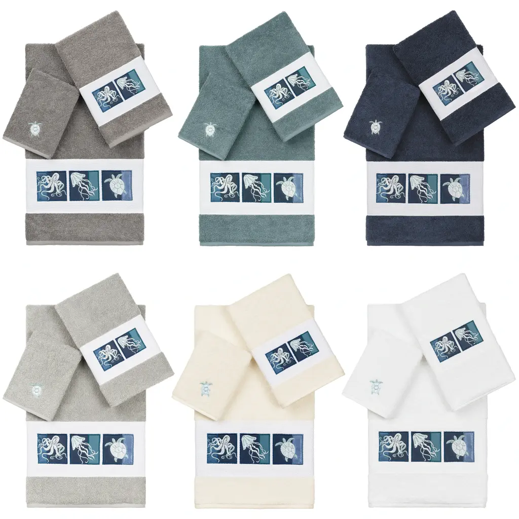 The Ava Embellished Towel Collection features glistening sea creatures framed in colors of the ocean embroidered on a textured woven border. These soft and luxurious towels are made of 100% premium Turkish Cotton and offer lasting absorbency and superior durability. 100% Premium Turkish Cotton Superbly absorbent and quick drying Available in a range of lovely towel colors Machine wash cold, No bleach, line dry or dry clean Set includes 1 bath towel (27" x 54") / 1 hand towel (16" x 30") / 1 washcloth (13" x 13") Made in Turkey