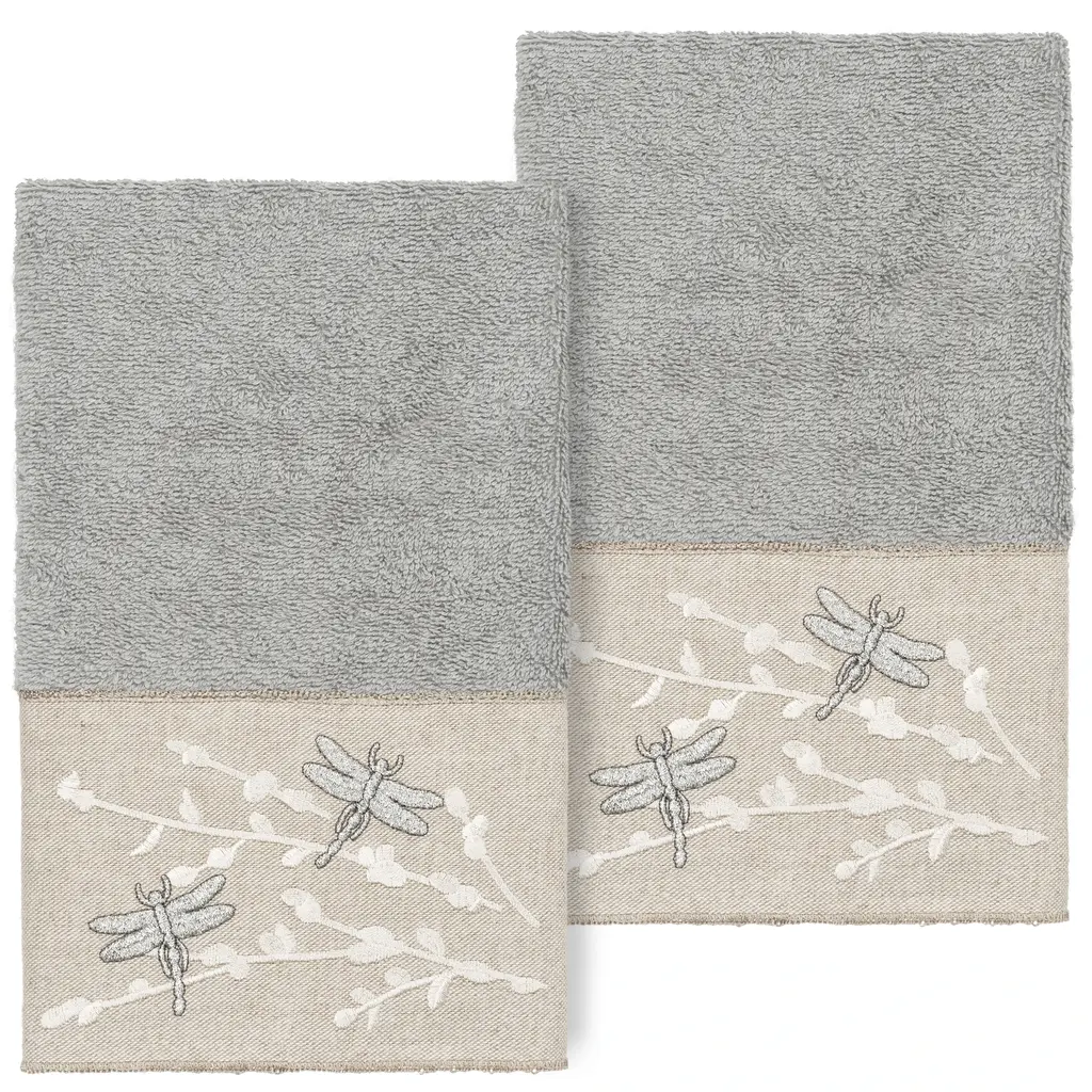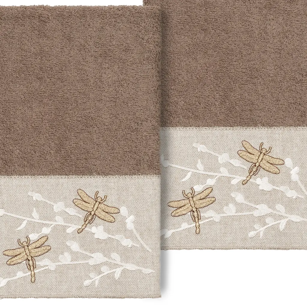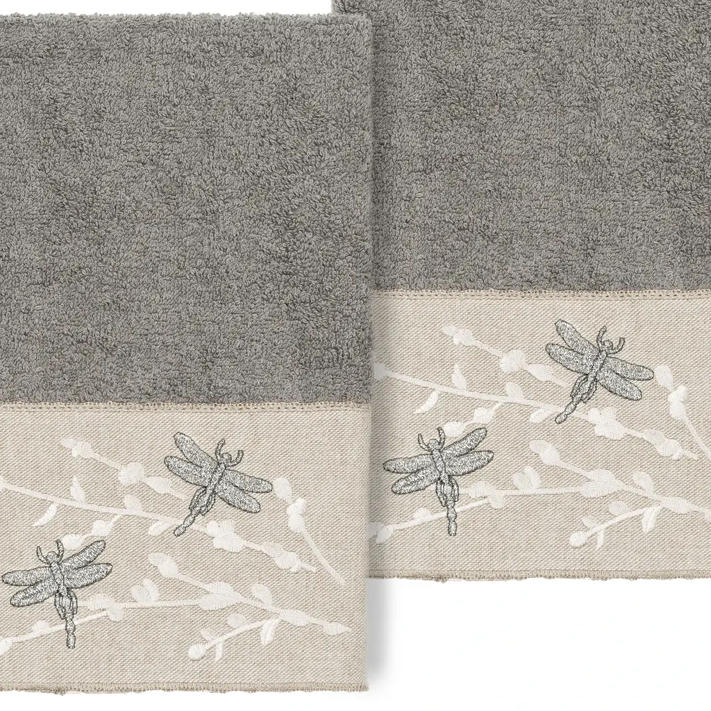 The Braelyn Embellished Towel Collection features glittering dragonflies flying among delicate branches embroidered on a linen-look textured woven cloth border. These soft and luxurious towels are made of 100% premium Turkish Cotton and offer lasting absorbency and superior durability.100% Premium Turkish Cotton Superbly absorbent and quick drying Available in a range of lovely towel colors Machine wash cold, No bleach, line dry or dry clean Set includes 2 hand towels (16" x 30") Made in Turkey Proudly Embellished in USA