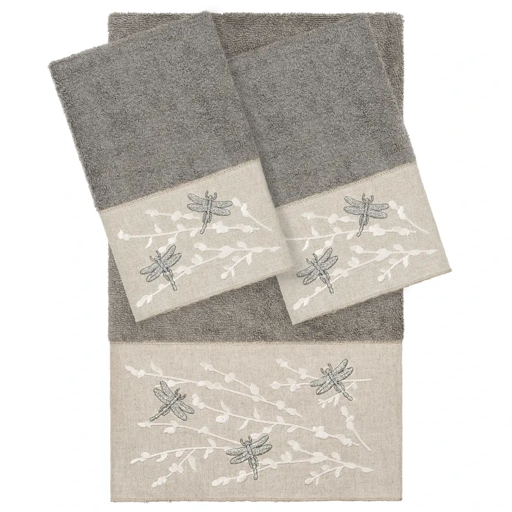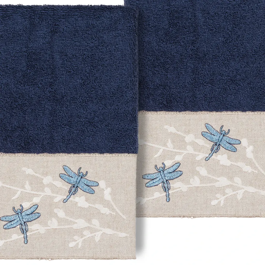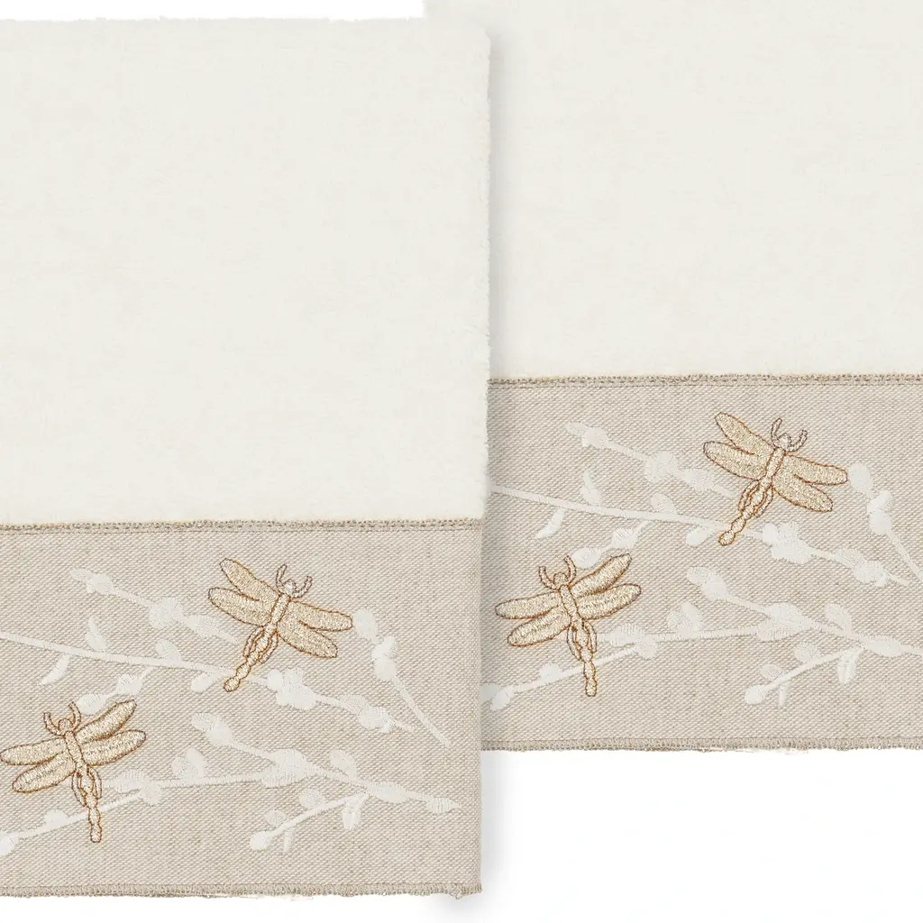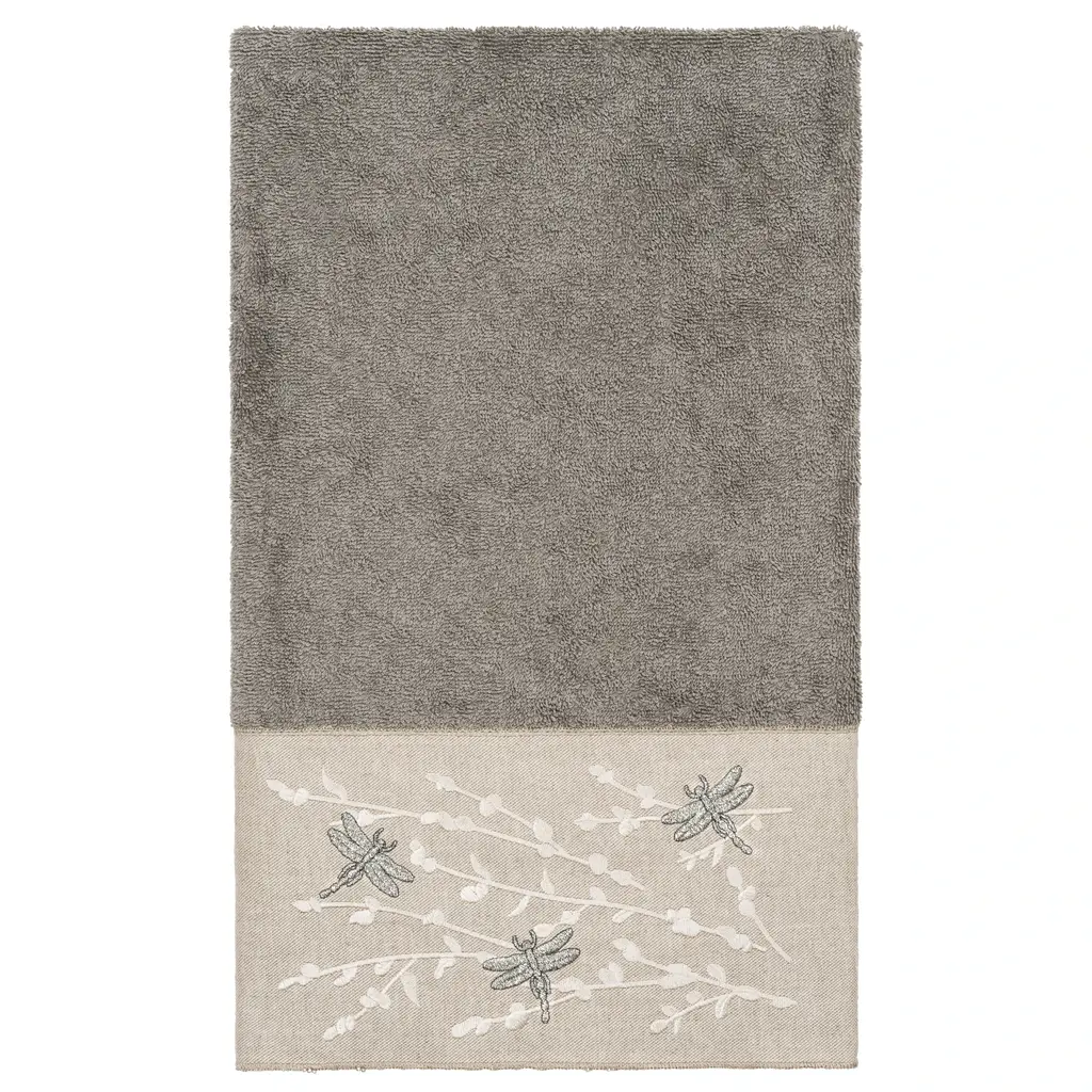The Braelyn Embellished Towel Collection features glittering dragonflies flying among delicate branches embroidered on a linen-look textured woven cloth border. These soft and luxurious towels are made of 100% premium Turkish Cotton and offer lasting absorbency and superior durability.100% Premium Turkish Cotton Superbly absorbent and quick drying Available in a range of lovely towel colors Machine wash cold, No bleach, line dry or dry clean Set includes 2 hand towels (16" x 30") Made in Turkey Proudly Embellished in USA