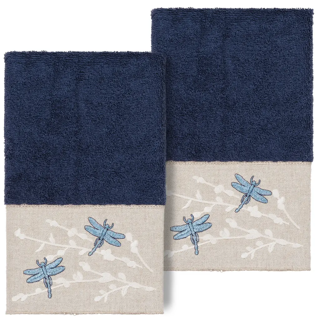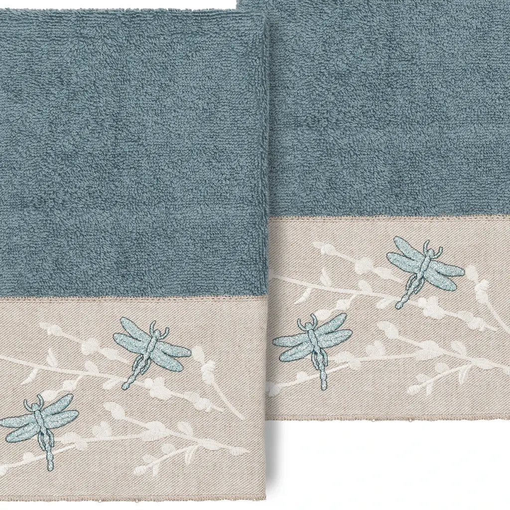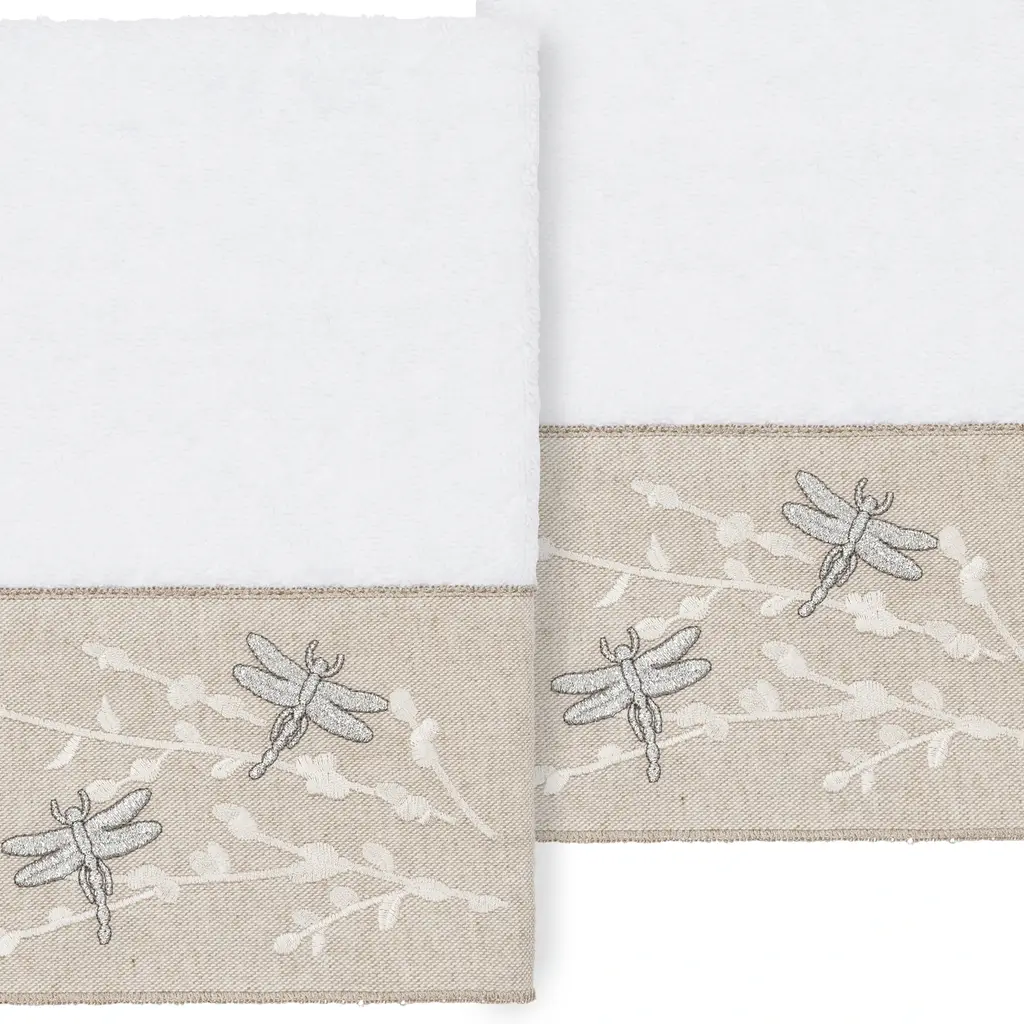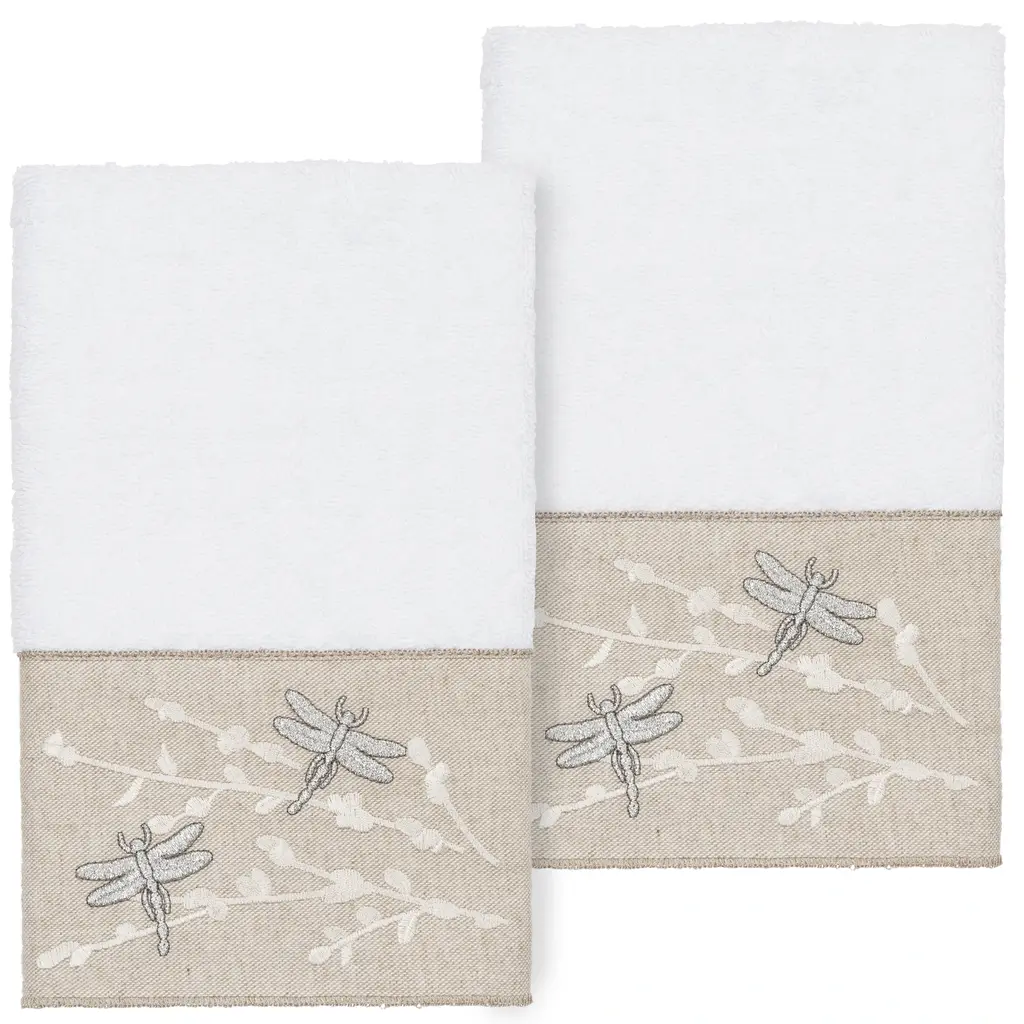 The Braelyn Embellished Towel Collection features glittering dragonflies flying among delicate branches embroidered on a linen-look textured woven cloth border. These soft and luxurious towels are made of 100% premium Turkish Cotton and offer lasting absorbency and superior durability.100% Premium Turkish Cotton Superbly absorbent and quick drying Available in a range of lovely towel colors Machine wash cold, No bleach, line dry or dry clean Set includes 2 hand towels (16" x 30") Made in Turkey Proudly Embellished in USA